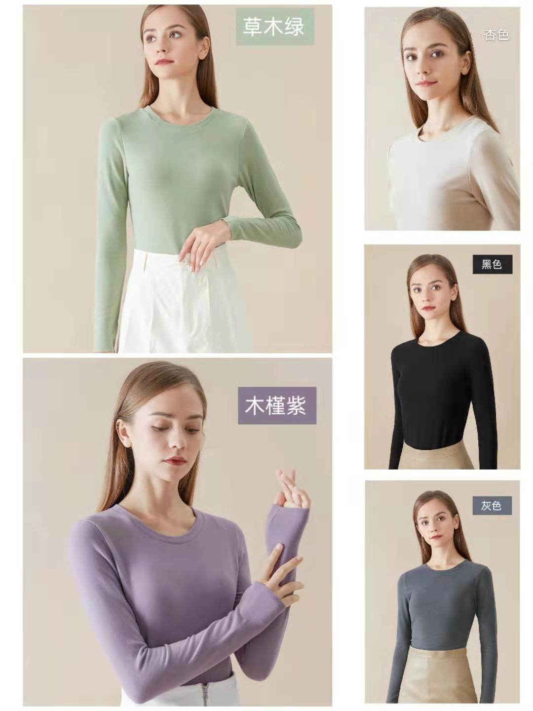 耐刮、耐刷,不易起球、变形,暴力一点用刷子划拉,来看看和普通面料的对比。天然活性染色工艺,揉洗也不易掉色。不过清洗时会有浮毛,属于正常现象,介意者慎拍。真的只要你穿一次,你会有把家里其它内衣全丢掉的冲动,舒服有型,保暖透气。单穿、打底、居家、睡觉,再冷的严冬,也能让你温暖过冬~我们的女士打底衫有圆领、高领和半领,相对于低的圆领设计更加保暖一点。高领个人感觉比较适合脖子修长的朋友,一共有5色可选:黑色,杏色,草木绿,木槿紫,灰色。