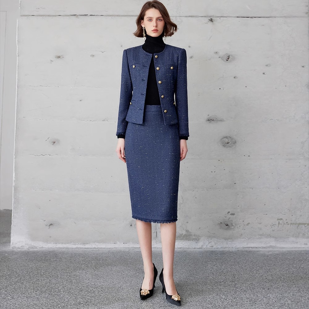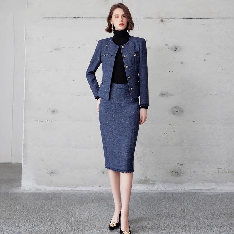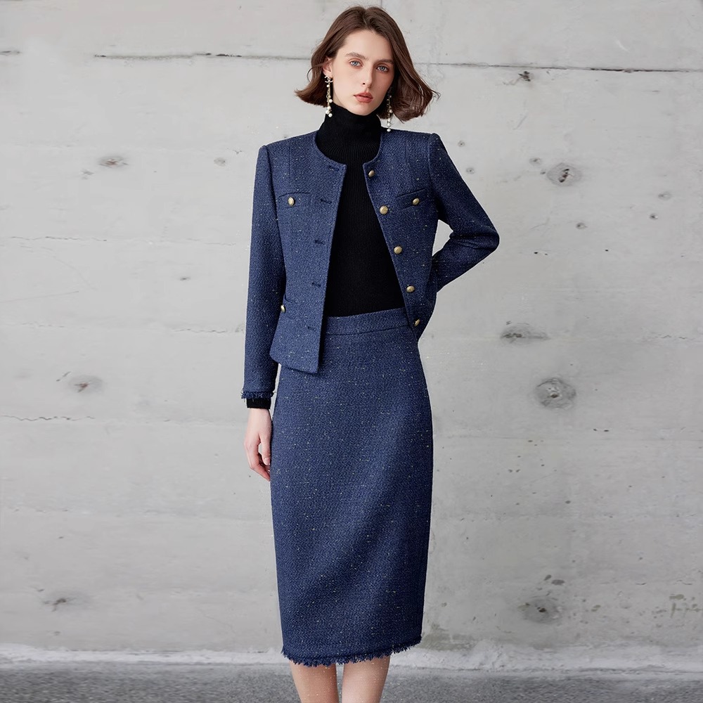 这套藏蓝粗花呢套装,以经典剪裁唤醒法式风情,圆领设计衬得颈部线条愈发修长,金色纽扣如星光点缀,在低调中暗藏奢华感。