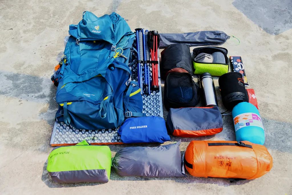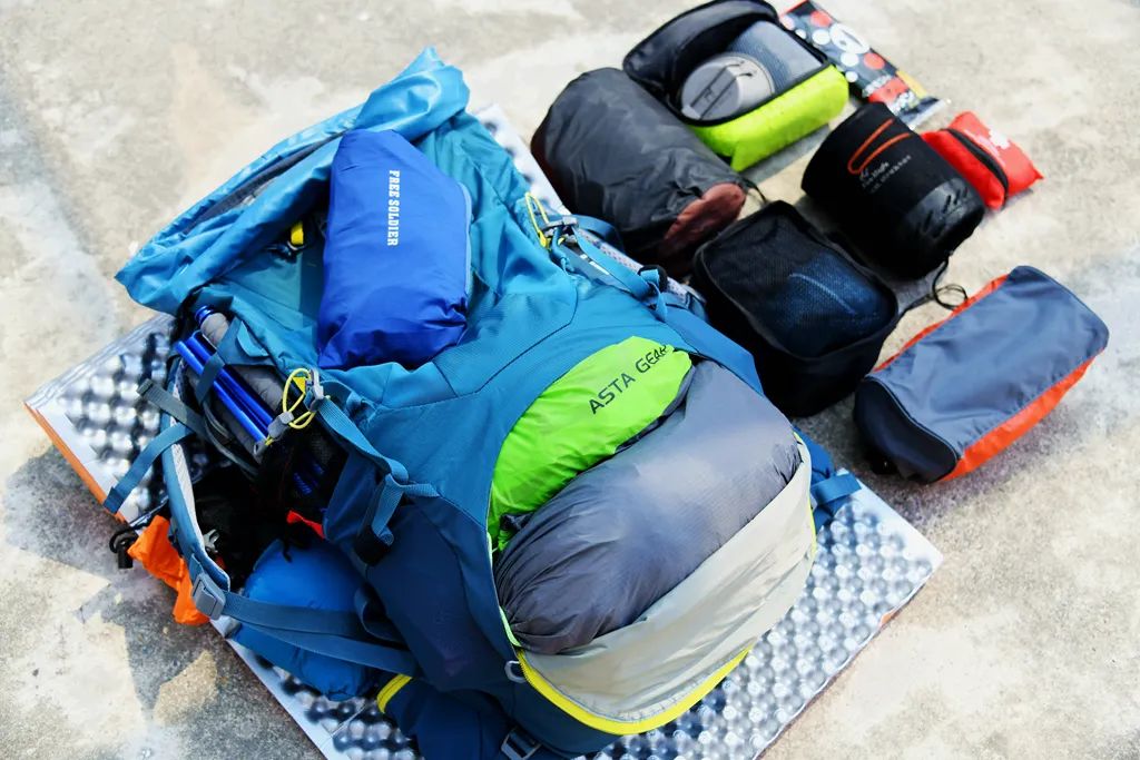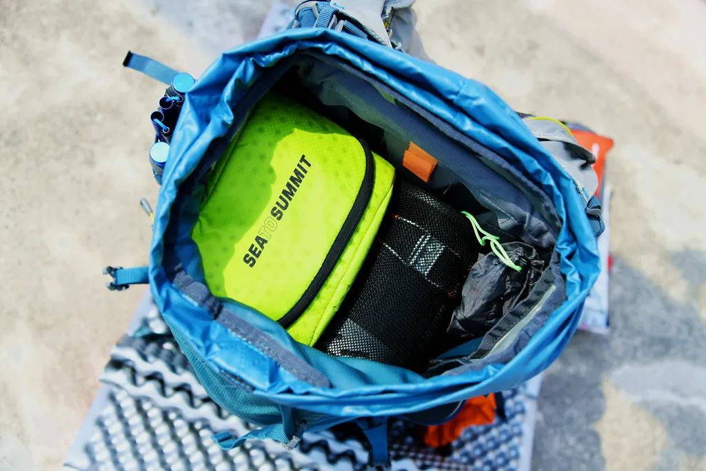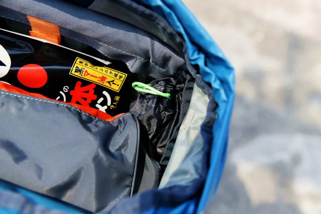 睡袋仓装载完毕后,主仓则依次放入防潮气垫和换洗衣物,再往上则是炊具水具用品,顶部则放置稍微重一些的餐食,主仓总体打包均为整理袋立体打包原则,空隙填充饱满,中上部遇到相对重的则靠向贴近背负位置装填。