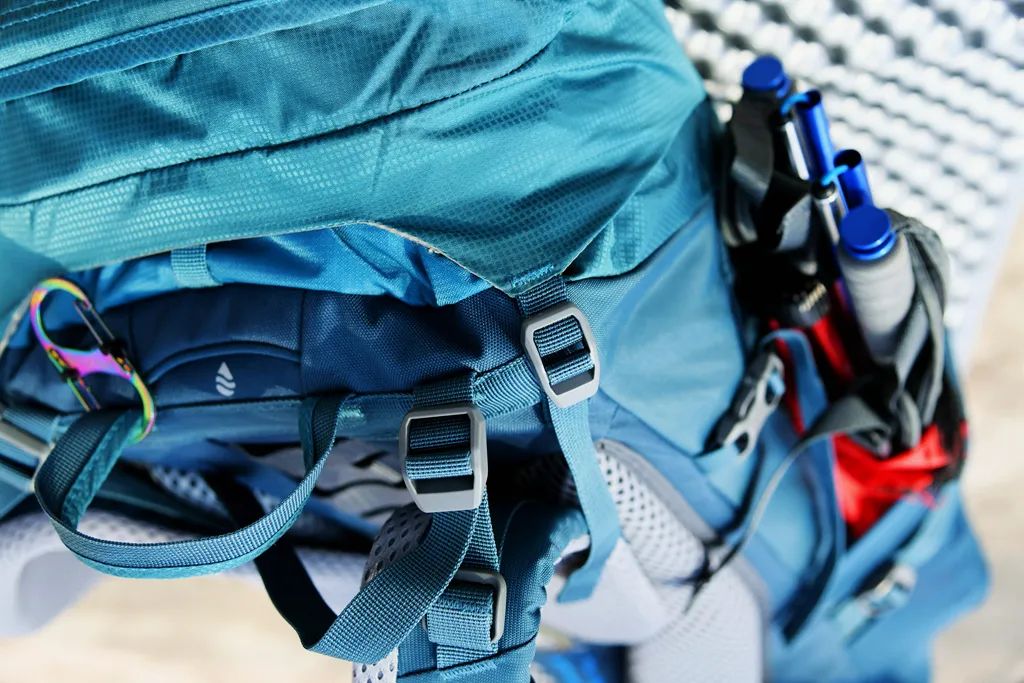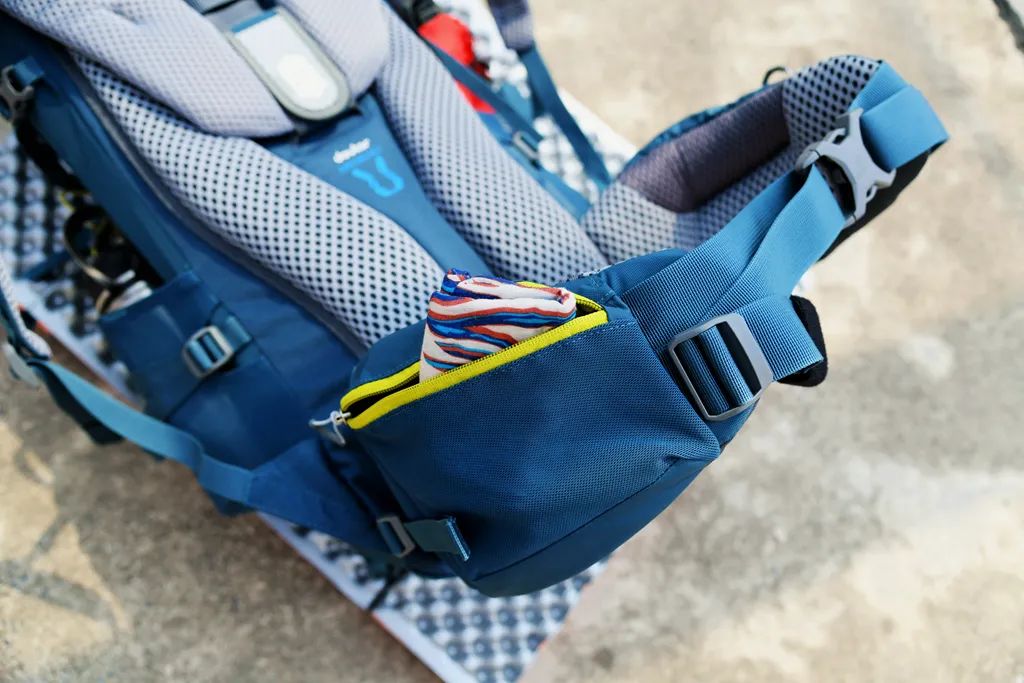 Aircontact Lite蓝精灵提供了多处织带设计,尤以侧面上部向上提拉紧固织带甚是喜欢,不仅可以固定处侧袋物品,而且使得顶部松散状态向后背收缩,大幅度运动时背包晃动度明显减轻。
