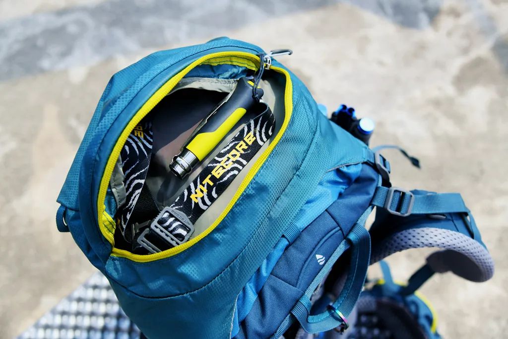 顶包后侧拉锁则放置头灯和随手需要装备。
