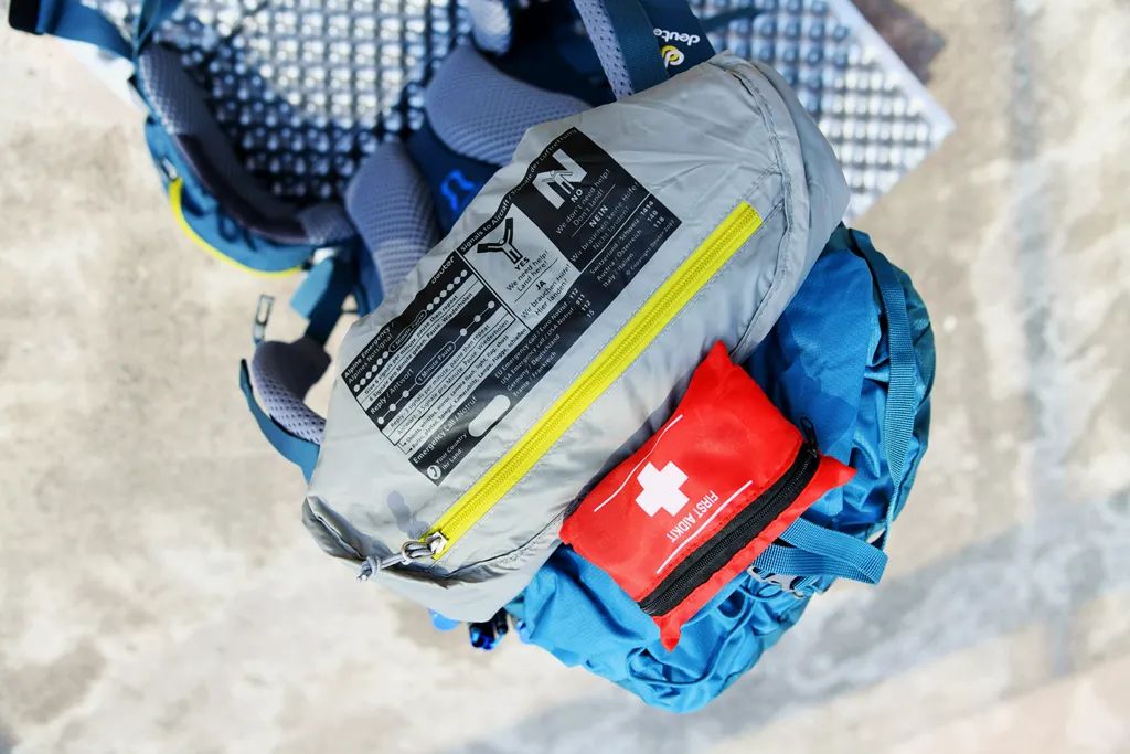 顶仓内层拉锁表面加印了求生常识,尤其是口哨急救呼喊的信息标识,指示稍显遗憾的都是欧美常识,有点水土不服。不过既然加了标识,就要利用起来,之前领队意识出行都会准备急救包,正好放置在这个顶包隔层。