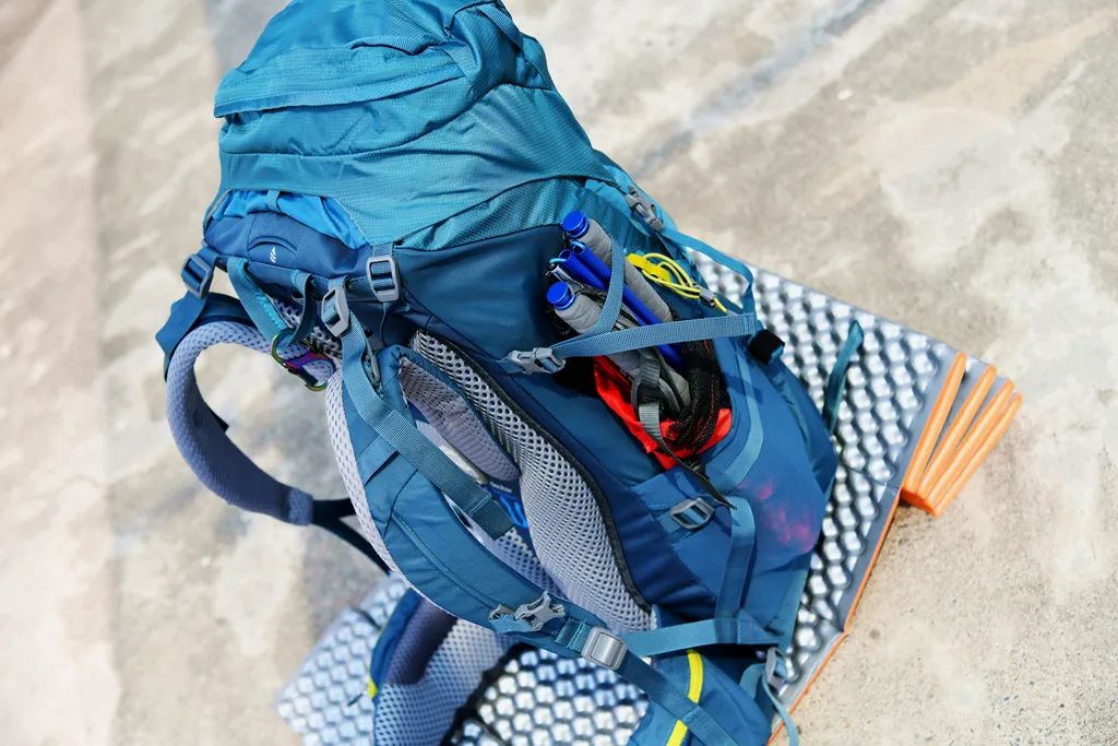 必备装备装载完毕后,帐篷杆则见缝插针的放入主仓侧后侧,依托背负“X”型结构,帐篷杆放置主仓并不影响背负形状。