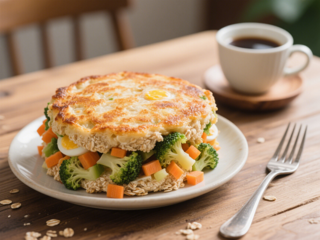 把燕麦麸与切碎的胡萝卜、西兰花等蔬菜混合,打入鸡蛋,加适量面粉和水调成面糊,在平底锅中煎至两面金黄。
