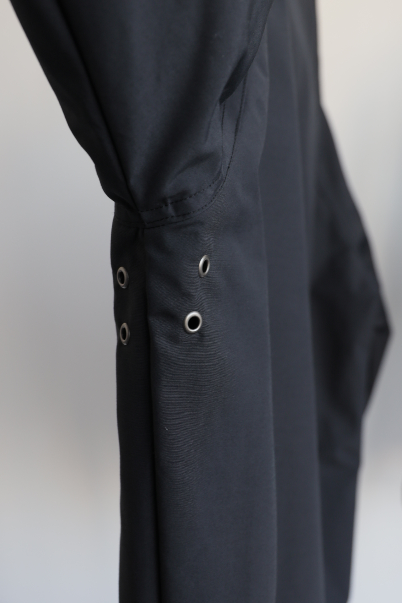 门襟采用胡桃色橄榄眼双目扣,呼应整体风格,袖口一粒扣可解。