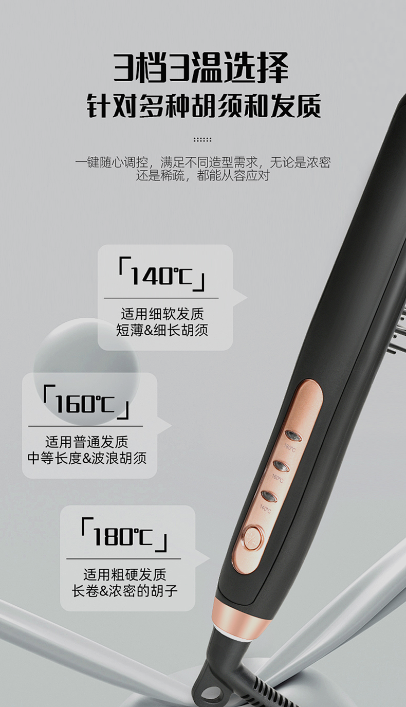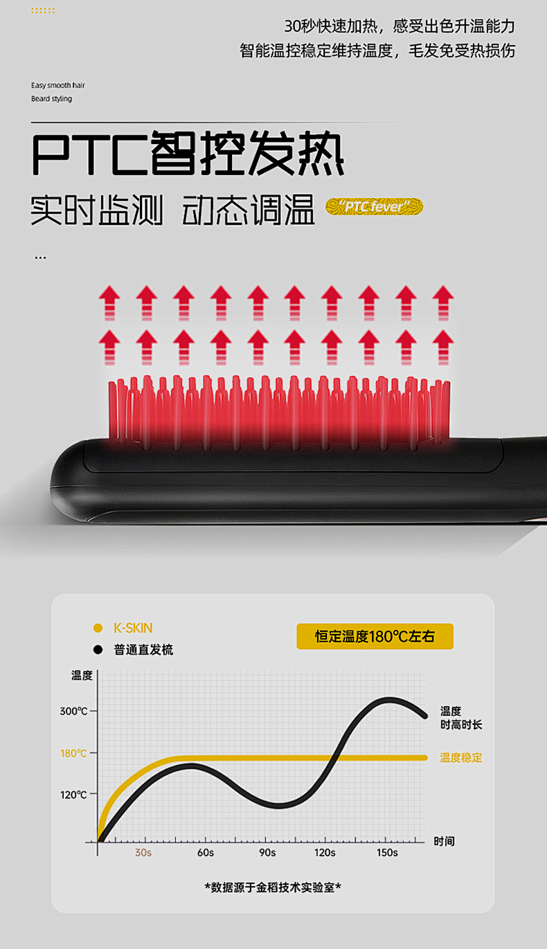 设有三挡控温功能140°、160°、180°适合多种发质使用。30 秒速热,采用 PTC 恒温发热技术,能够让热量均匀分布到每一根发丝。梳齿防烫设计,即使是很短的头发也能轻松打理。无论是做卷还是拉直,都能轻松实现。
