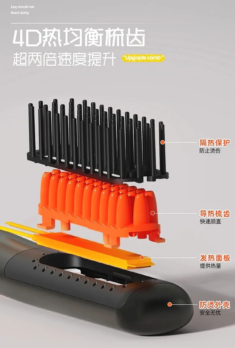 这款男士直发梳在原有基础上进行了全面升级。它采用了 4D 热均衡梳齿,其中包含 31 个导热梳齿和 28 个辅梳齿,抓发效果更好,打理更便捷。