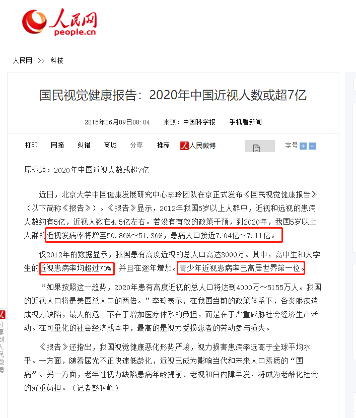 2018年7月,教育部发布的《中国义务教育质量监测报告》,也提到了“学生视力不良问题突出”,印证了我国近视问题有多严峻。