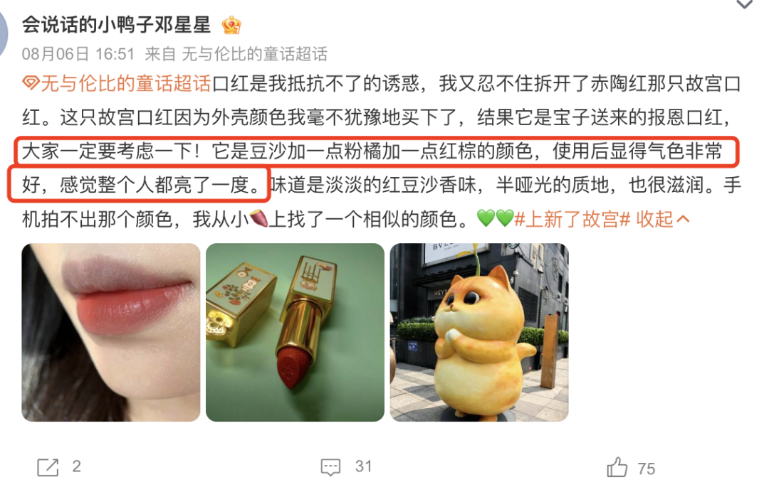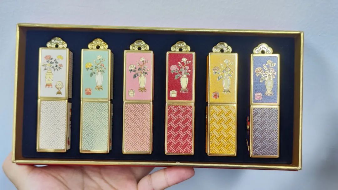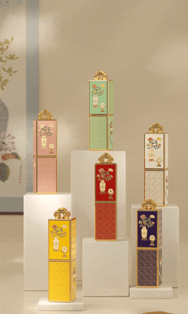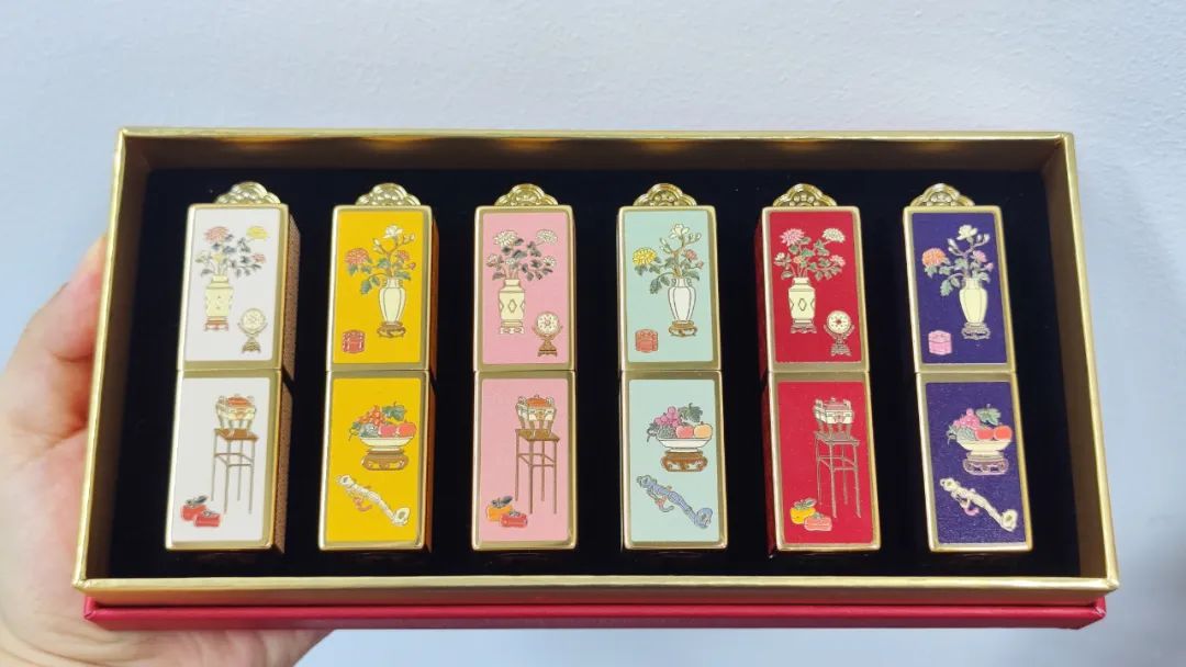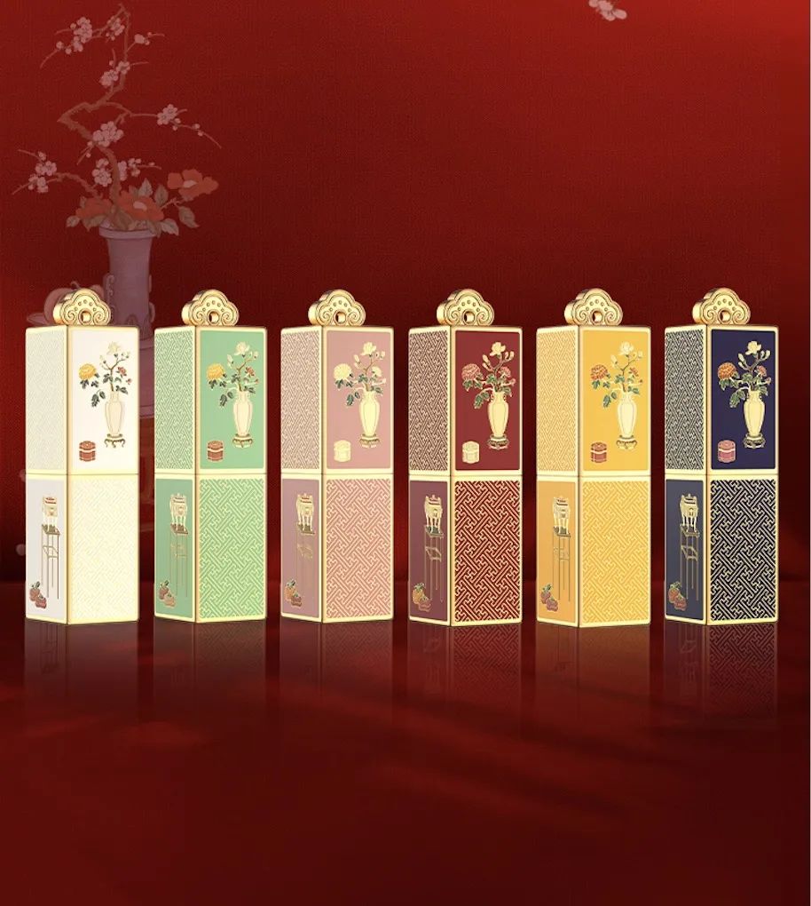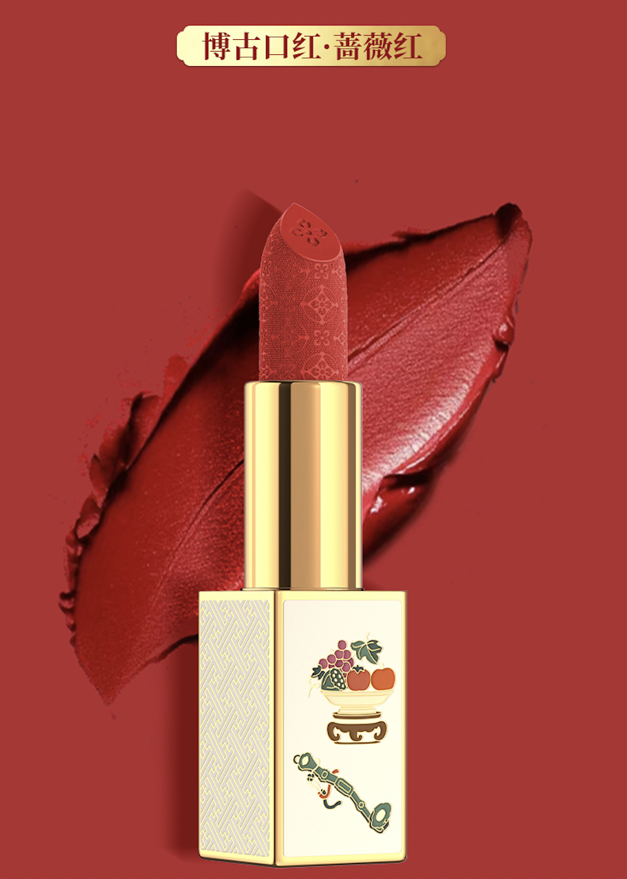 当我们谈「文化自信」「审美自信」的时候,我们在谈什么?有位美院的朋友和我说,很久以前开始,美院学生就多了一门“选修课”——去故宫参观、写生。这个有着上下五千年文化缩影的宫殿,沉淀了太多或精巧或厚重的历史传承。不经意的角落,都蕴藏着历久弥新的文化瑰宝。这些年,它也持续在输出各种独具中国特色的文化产品,顺应时代的变化,以文物实体为源,以中式美学为根,融合现代审美,展现中华文化的现代魅力和国际影响力。虽然 2~3 年才出一款产品,但每次推出,都备受认可。其实早在2019年,我们就已经开始和故宫美妆团队合作了。第一代故宫口红,从打样阶段就开始参与,最后的成品完美到超出我们所有预期。而今天给大家带来的,是故宫美妆团队今年才发布的「故宫口红」系列新品——团队采样故宫内经典纹样、古人日常生活中会用到的美物,最终做出这一套非常精美的博古口红。这6支口红,以 6 件寓意美好,色彩风格明朗的文物为源,采用现代技术将花卉瓜果“织绣”于口红外观。再搭配故宫传统釉色朱红、甜白、明黄、豆青、粉彩、霁蓝6种底色,极具国风美感。唇色灵感全部取自于故宫博物院馆藏文物,每一支都无可替代,实用且各具气场。这几支口红涂出来,保准你会成为别人眼中“她今天的口红,为什么这么好看?”