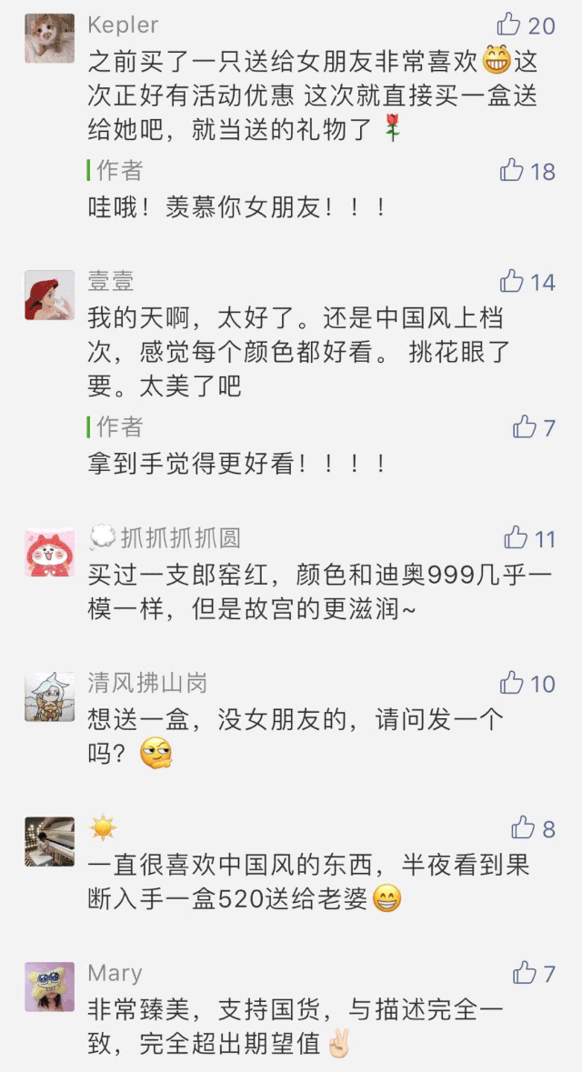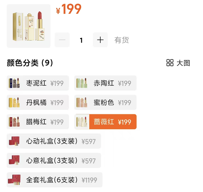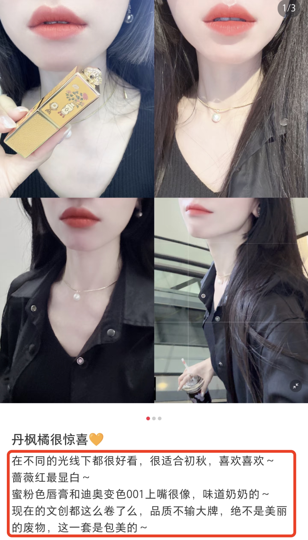 蔷薇红在雾感缎面的映衬下,更显温柔与浪漫,如同清晨露珠点缀的蔷薇花瓣,既鲜艳又带着一丝羞涩。这款雾感缎面质地的赤陶红,简直是信手拈来的复古港风!!如同冬日里傲霜斗雪的腊梅花,虽不张扬却难掩其独特韵味。很像di*r999的那种正红,又没有那么艳,稍微深一点点,非常好看!这种颜色秋冬配一身深色大衣简直是绝配cp(更建议黑色➕卷发),自带电影氛围感!丝绒哑光质地的丹枫橘,如同秋日里满山的枫叶般绚烂夺目。它既有橘色的活力与温暖,又在丝绒哑光的质感下,展现出一种低调而奢华的美。蜜粉色在丝绒哑光的质地下,展现出一种别样的温柔与甜美。它如同春日里绽放的花朵般娇嫩可人,又像是毛茸茸的蜜桃那样诱人~旗舰店上,故宫博古口红的单支价格是199元,全套价格1199。这可是故宫口红啊,正品保障,无论送礼自留都很有“说头”的好产品,这种比5折还低的价格,可遇不可求!这个口红的管身设计也很好看!掏出来补妆blingbling的~以金色为底色,模拟传统“刺绣”质感,用高精度的浮雕打印工艺,还原瓷器的灵动细腻。纹饰、画面宛若“真”绣上去般,在金色外壳的映照下,还散发着迷人的余光。“我从来没做过如此精美的口红,真的是雕刻出来的!”还在口红管身增加了如意云头设计,可以自行搭配串珠流苏。你可以选择自己喜欢的进行更换,DIY一款独一无二的口红。口红盖子是磁扣设计,合盖时不用特意盖到底,只要轻轻一推,“嗒“的一声,就盖好了。口红管身的每一面都可以随意搭配,可以花色配花色,万字纹搭万字纹。而且,和那些被大牌误解的“中国风”不同,故宫连礼盒的设计都非常有味道,简约大方,典雅别致,说是惊艳四座也不为过。在口红遍地撞衫撞色的今天,你从包里拿它出来那一刻,就能成为全场焦点~