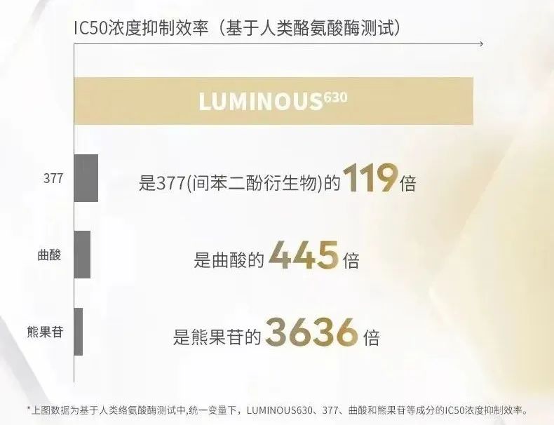 LUMINOUS 630从最高效的一环着手,从根源抑制黑色素,表现比许多同原理的成分都出色🔽