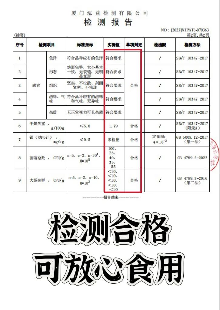 经过严格的审查、检测,各项指标合格达标,品质放心,吃的安心。