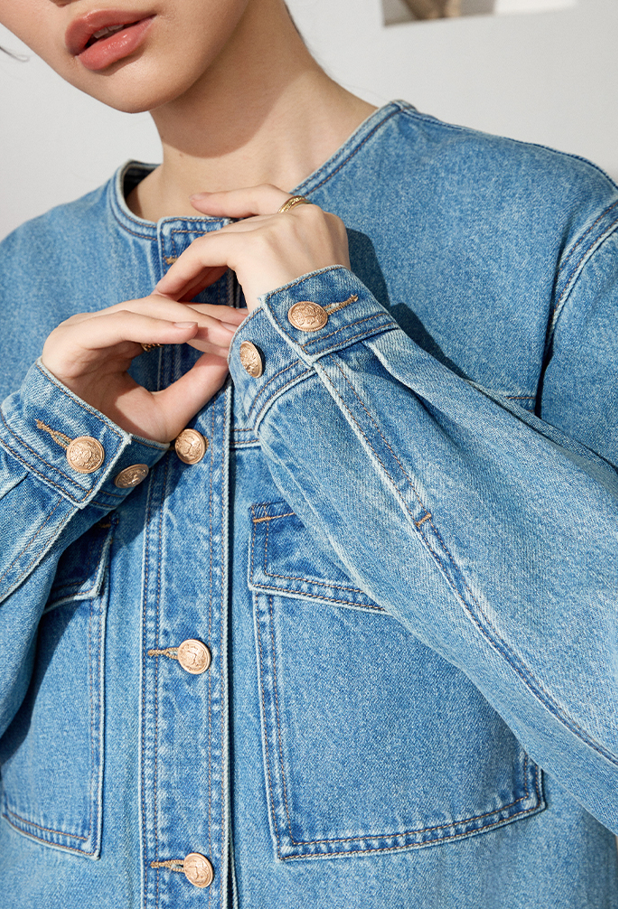 经典的牛仔夹克,去掉了翻领的设计,整体少了几分利落感,更秀气优雅。