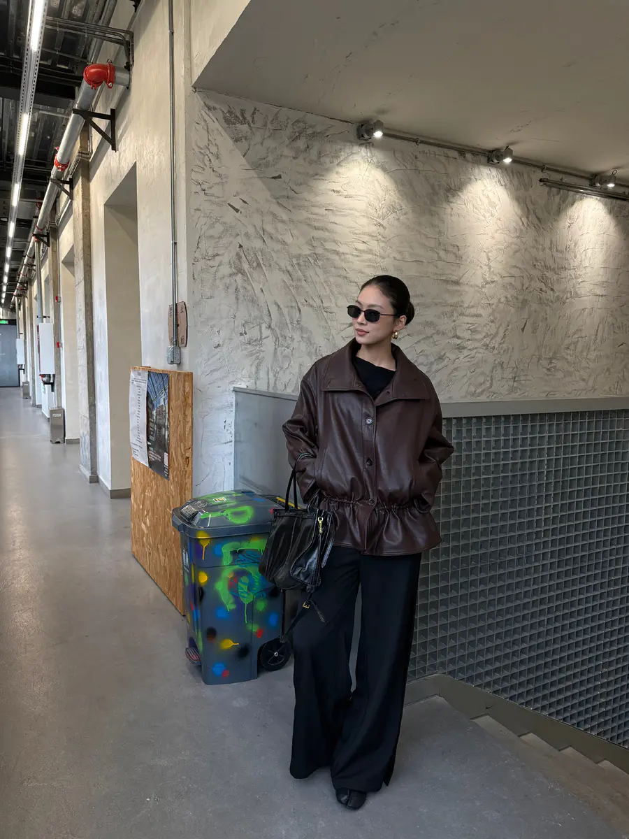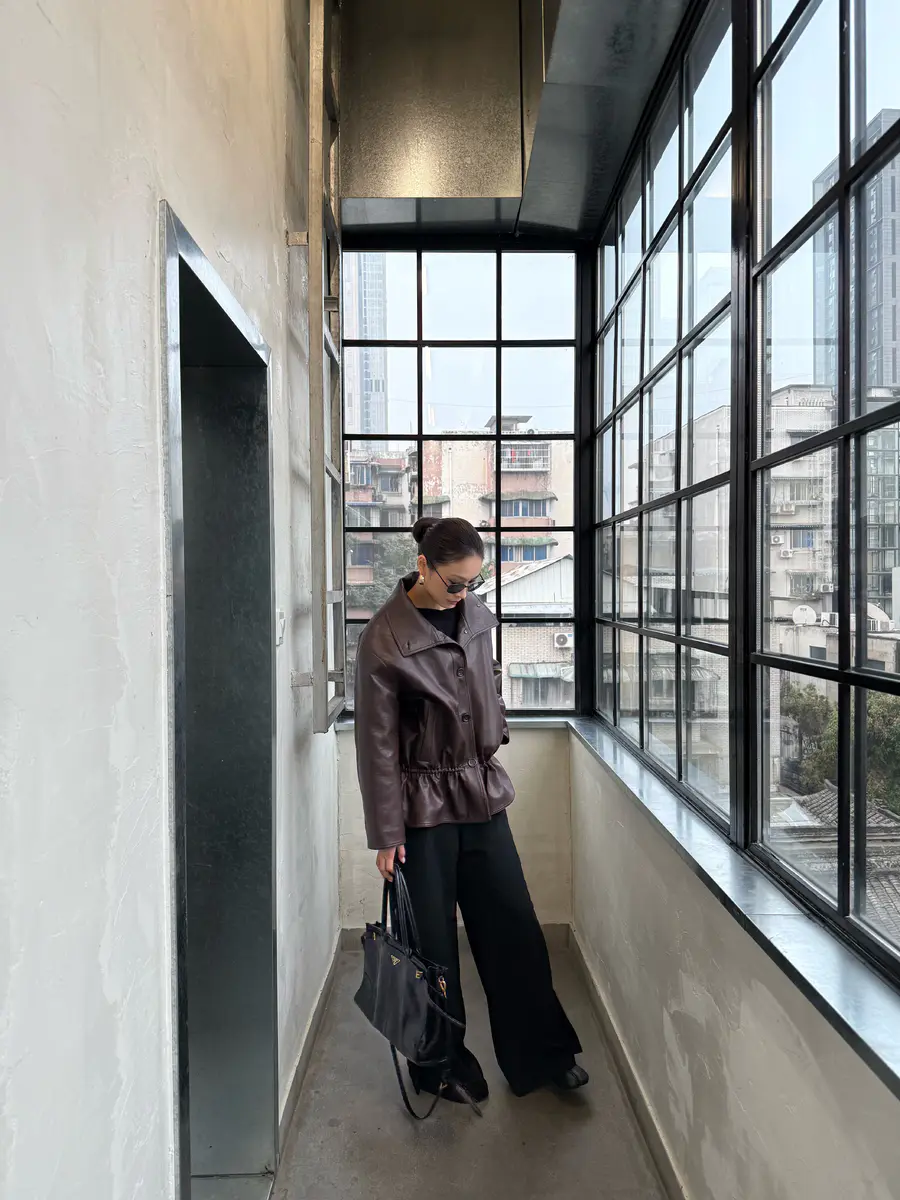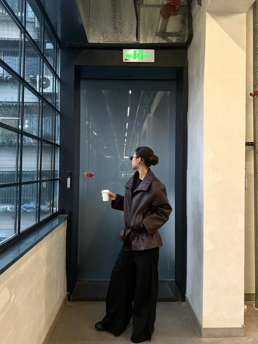 我的办公室穿搭🍣收腰皮衣+弯刀长裤,干练中带着时髦距离感。