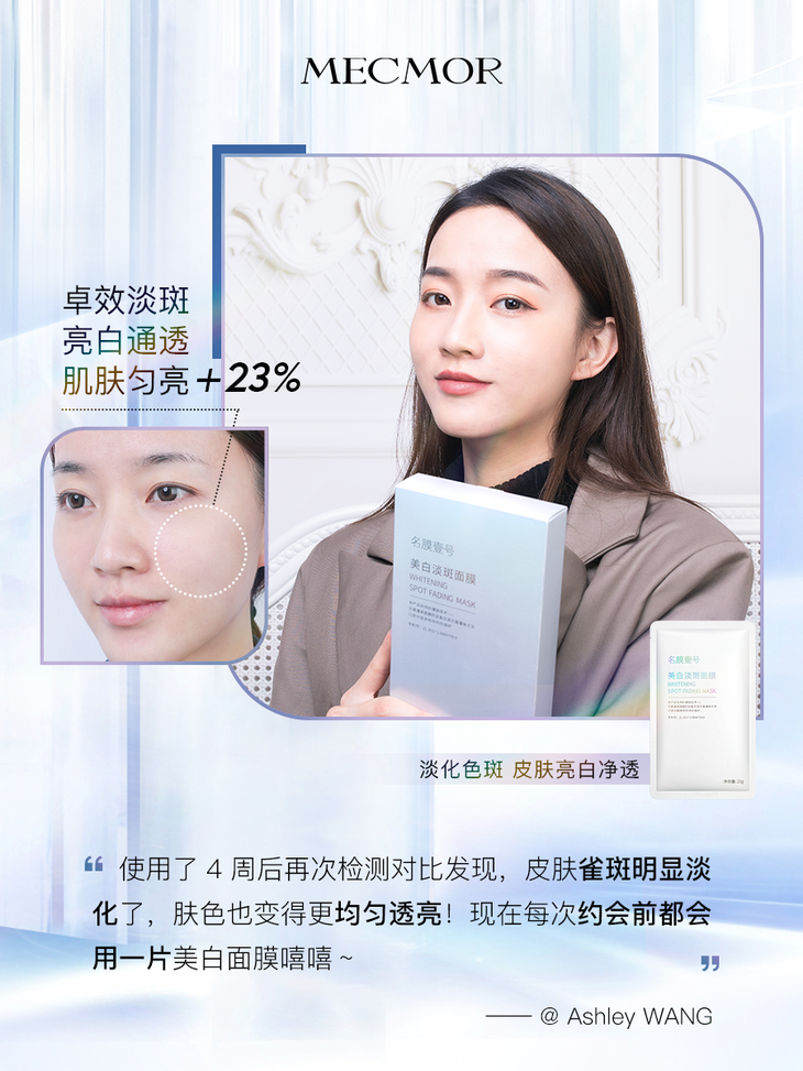 MECMOR「美白淡斑面膜」蕴含α-熊果苷和柑橘果皮提取物,能够由内而外精准剥落、击散、干扰、抑制黑色素,深度美白,淡化斑点!