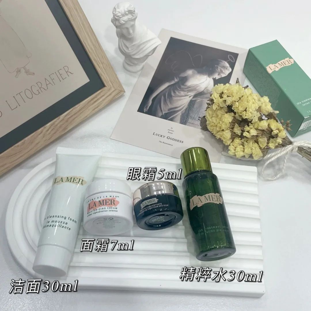 小小的体积,随便塞进行李箱,就可以携带,从洁净洗面奶到清透底妆,全套的养护,非常的贴心细致了!作为小样的包装设计也非常贴心,面霜、颈霜以及眼霜的盒子都一比一还原了正装,直接拧开就可以使用,非常方便。洗面奶的挤压式软瓶身设计,使用多少挤多少,精准控制使用量,而且有效保证瓶内部分的干净卫生。精粹水的瓶子也非常贴心,新版精粹水的瓶子新增了封口,更小瓶口方便控制用量,不会倒出太多浪费。镜子小巧精致,折叠设计,双面可用,拿在手里很有高级感,出门在外随时补妆倍体面。精美绒布袋+礼盒包装,仪式感十足,数量有限,送完即止!