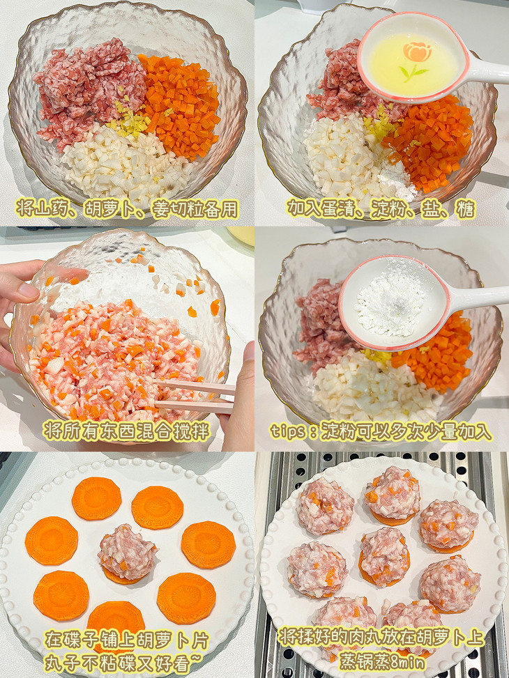 3、将所有食材充分搅拌混合。胡萝卜切片,在盘子上铺底,将混合好的肉糜捏出丸子形态,放在胡萝卜上