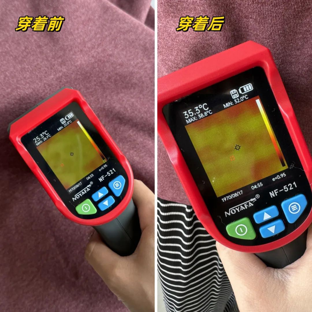 为了让大家直观得感受到它到底有多保暖,我们特意找来了红外热成像,给大家测试一波它的自发热效果。大家可以看到在穿上打底衫后,体温从原本的25.3℃左右,上升到了35.3℃左右~这种体感,就像冬天的阳光照在身上一样暖和舒服,谁穿谁知道~