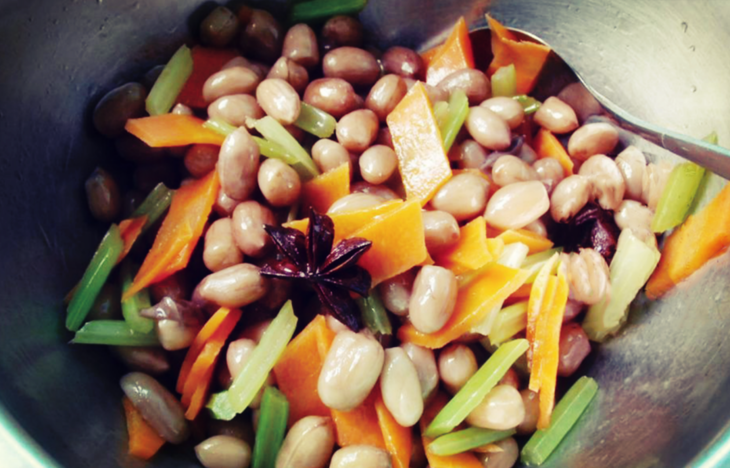 1、锅中加清水,放入花生米,调入酱油2汤匙、白糖半汤匙、桂皮1片、八角2个,五香粉和盐根据个人口味添加,大火烧开后转小火煮至花生熟而入味,约半小时;