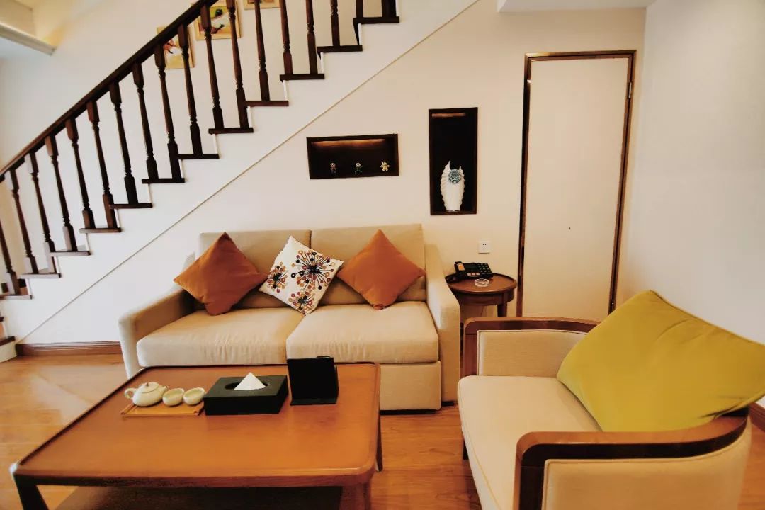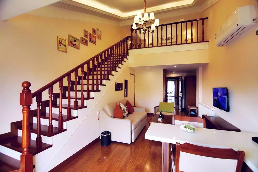 木质手扶梯,楼下是大大的客厅哦!现代化的装修风格,清新雅致~客厅、沙发、茶几,各种配套设施一应俱全~