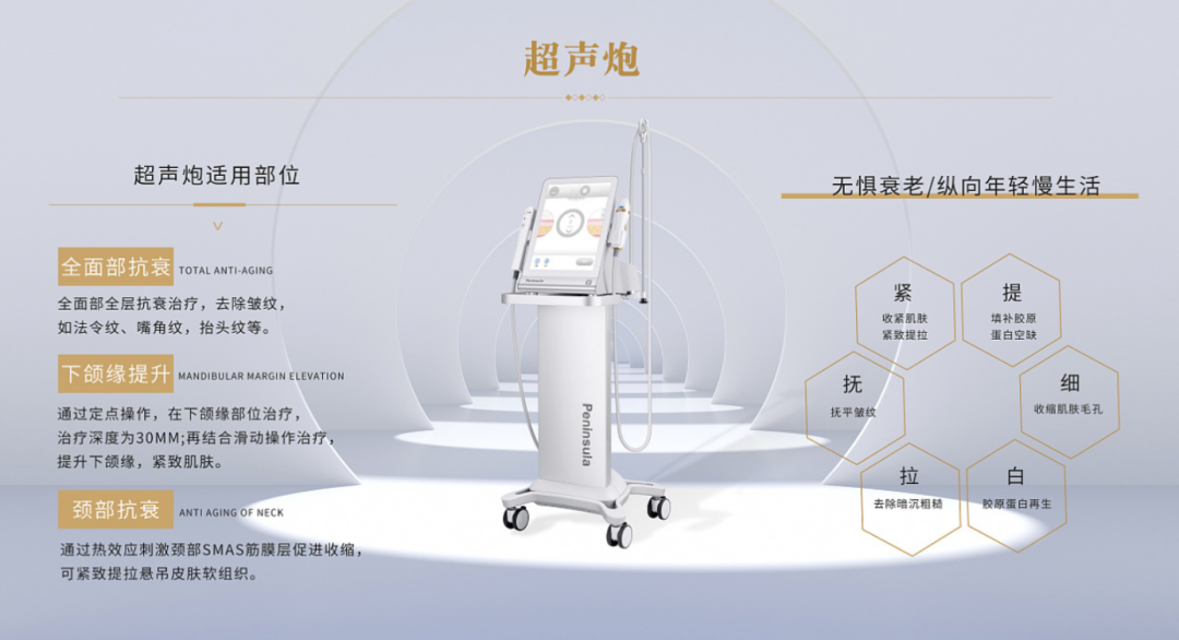 超声炮:针对性的直接对筋膜层输出能量,筋膜由内而外的收紧。