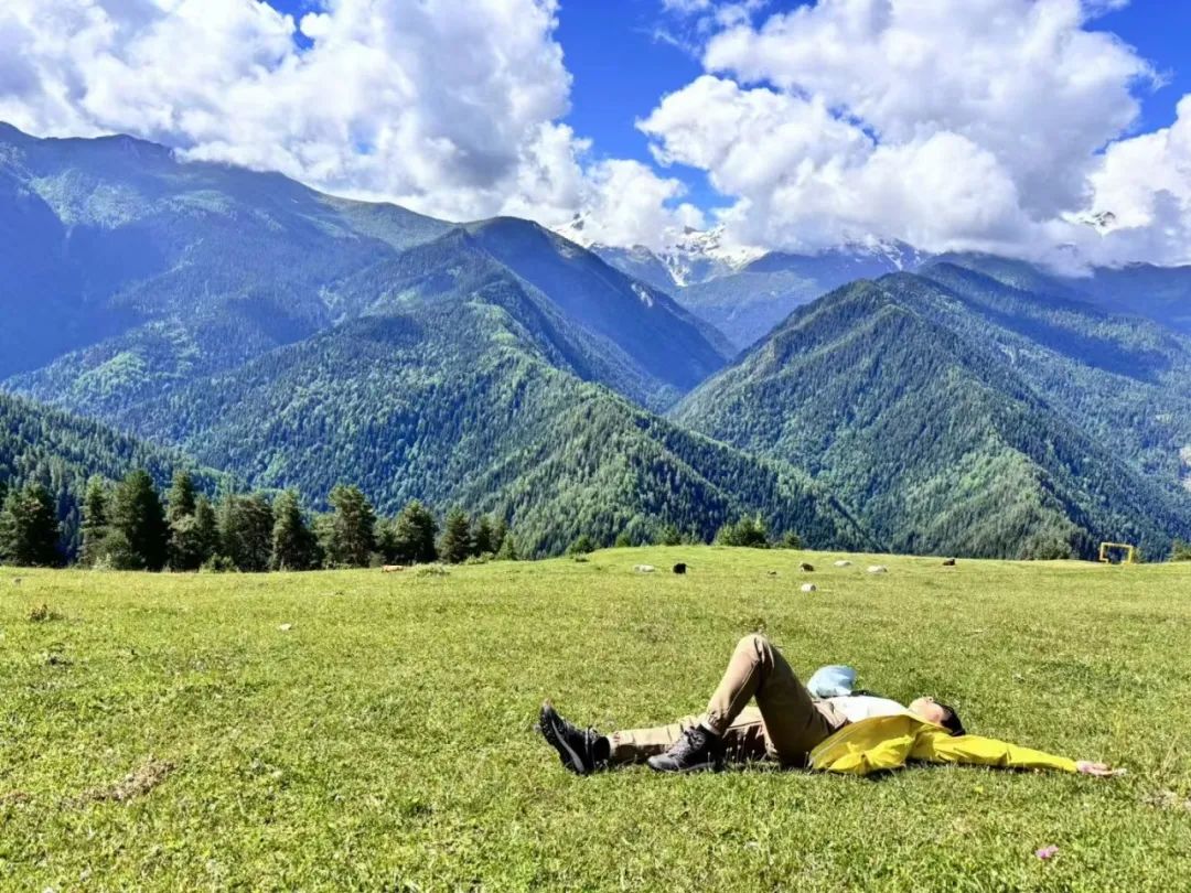 我们徒步往返18公里,寻找被称为世上第二个阿尔卑斯少女峰的Chaukhi 雪山。这里游人罕至,原始的草甸、溪流、雪山风貌,配上正值盛开的山花、俊逸的骏马,狠狠地过了一把寻找“我的阿勒泰”的瘾。
