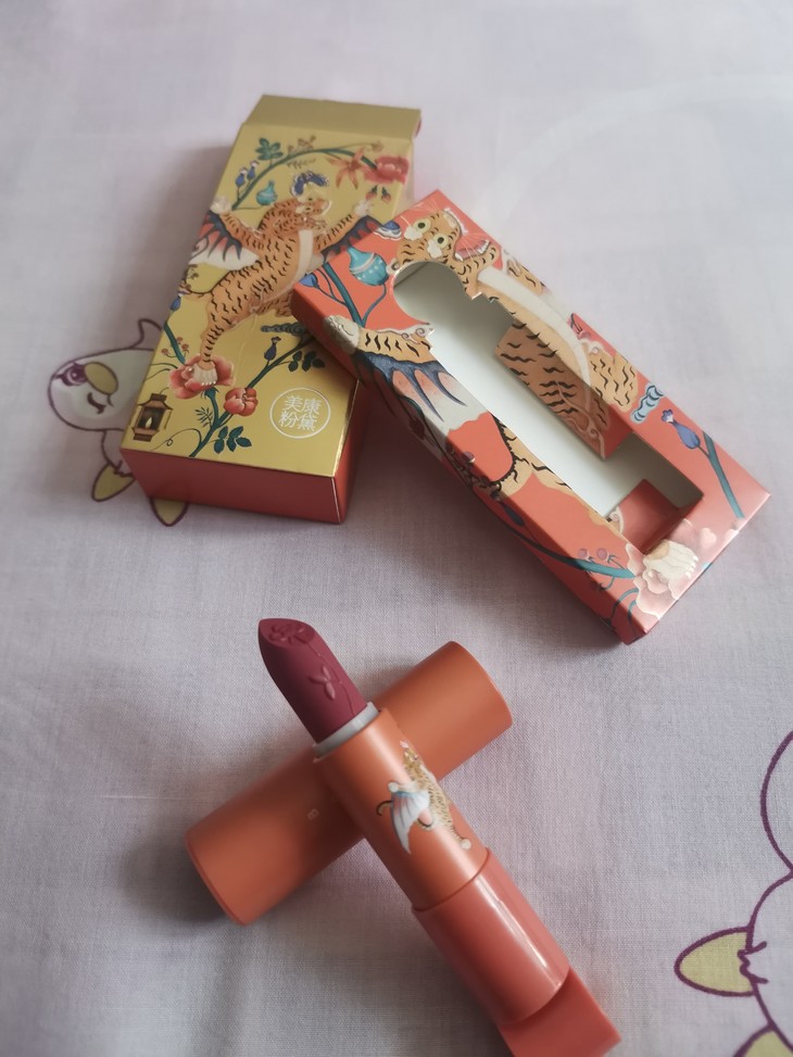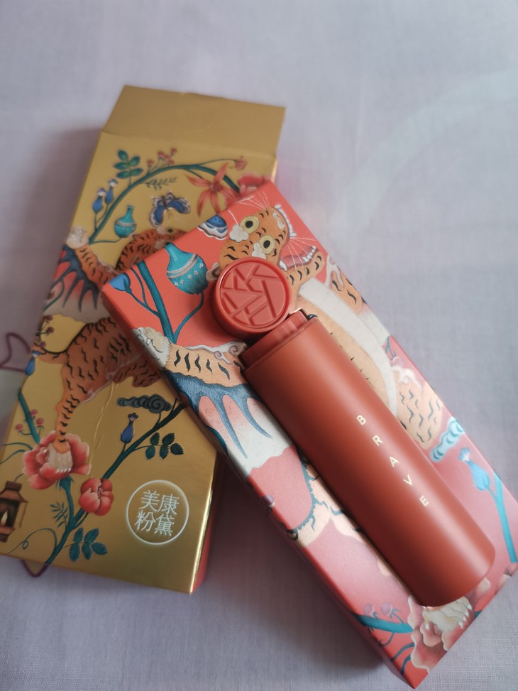 若水口红是美康的老产品了,但是它一如既往的没让我失望。接下来我就来介绍介绍我们这位美康的老主顾。 首先这款口红的包装非常精致,外包装上面还是只展翅的老虎,有可能是某种神兽吧,我不认识 其次就是口红的包装壳后带了个小球球,是能转动的,非常好玩。并且上面印有美康的专属标志,这让整支口红一下就变得高贵了起来,而且它还是磁铁设计,每次打开口红时那声音,那手感真是超级棒。 最后就是这款口红颜值是这么高出了天际,口红膏体上有浮雕,真的是超级好看这个设计真的是yyds了,以至于,我之前一直都不舍得用它。我买的这个新生521颜色是那种干枯玫瑰的颜色,涂上整个人瞬间就高贵起来了,而且非常显白,真的是超级显白显气色。它的质地就是那种很丝滑,很雾面的,但是它很滋润,不拔干,不显唇纹。 最最主要的是这么高颜值的口红它还不贵,简直是宝藏,怎能不爱呢!