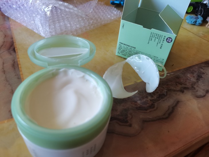 颈霜一到手我就拆开试用了,首先从产品来说,这个颈霜容量很大一个100g,膏体白里带点淡黄色。使用的时候很容易推开,比较滋润。味道是一种草本的味道。但是不是每个人都能接受这个味道,建议多出点其他香味。再说这个产品的设计。盒子是通体白色,盖子则为绿色的。每层不是常用的盖式的,而且拉环封口的,建议可以改进一下。这个拉环不是很好用,其次打开后配了一个勺子还是很有细节,问题开封后勺子在盒盖上放不稳容易掉到霜里面。建议调整一下设计
