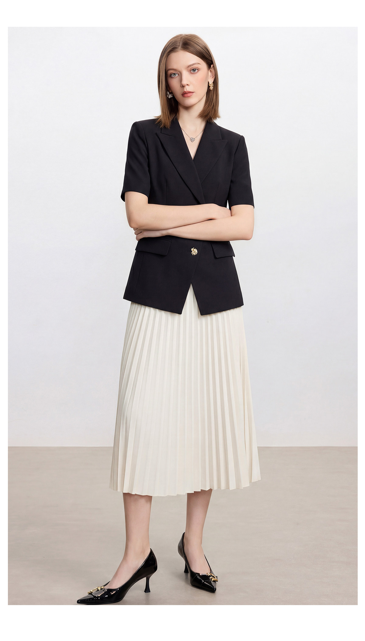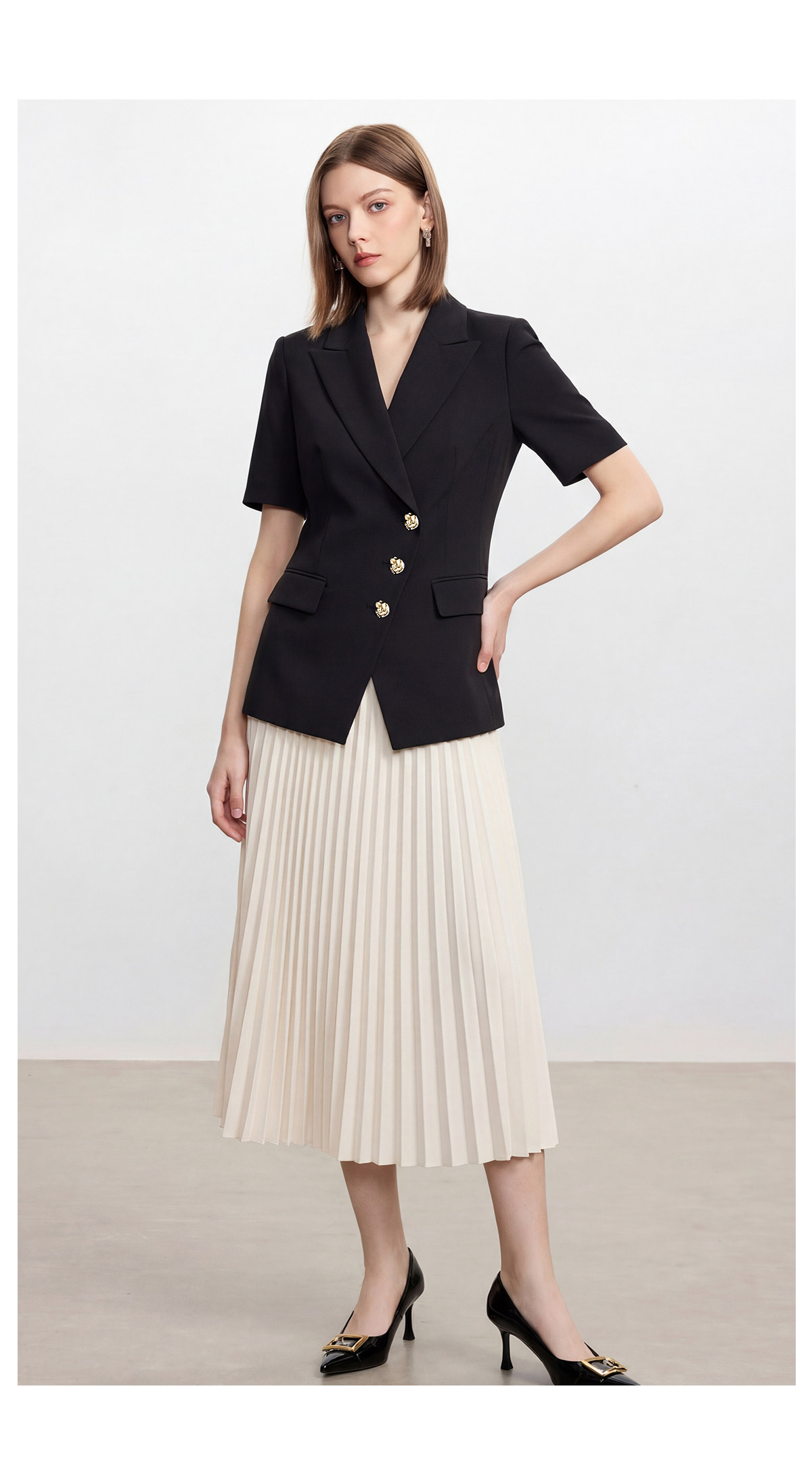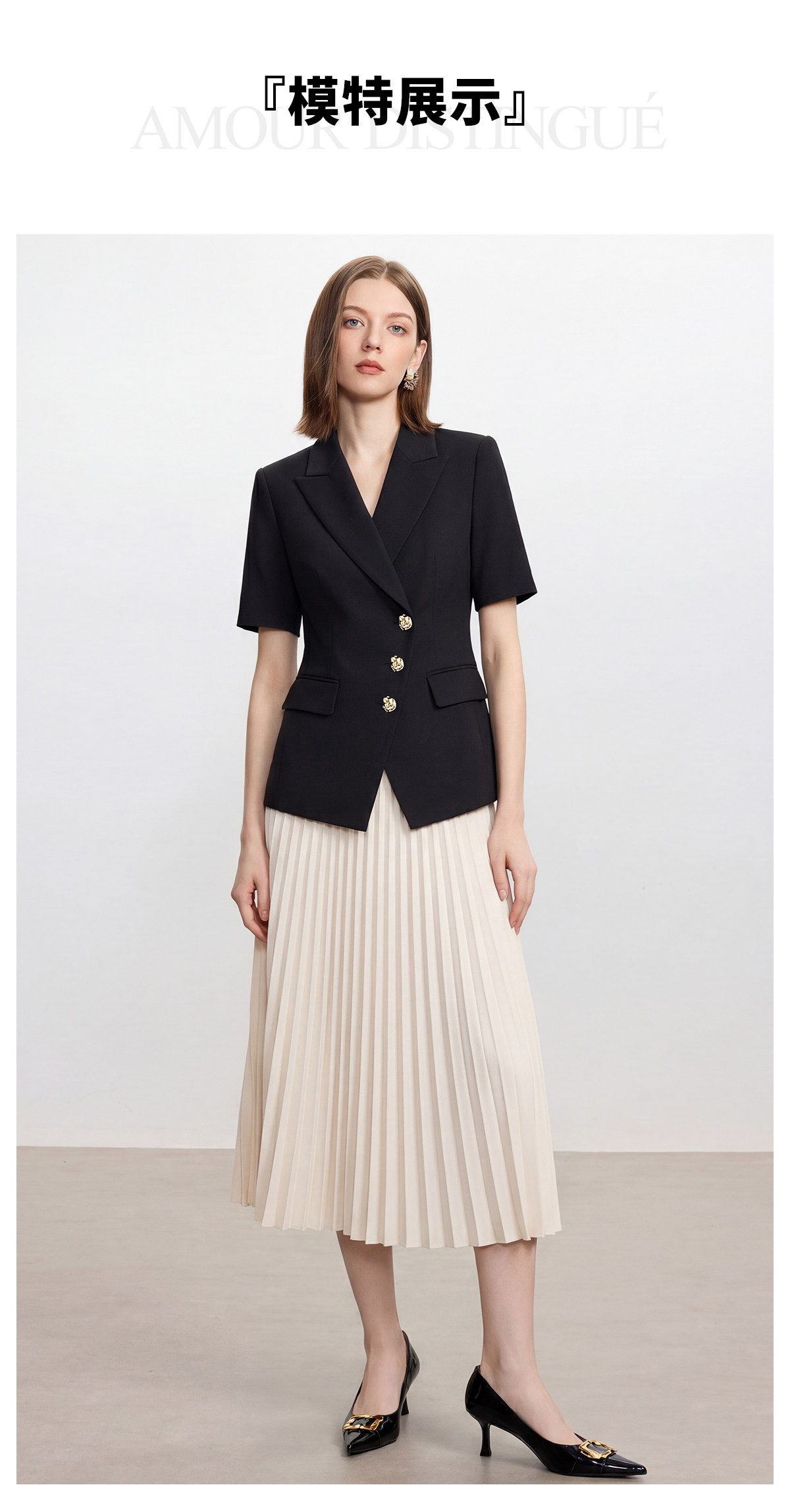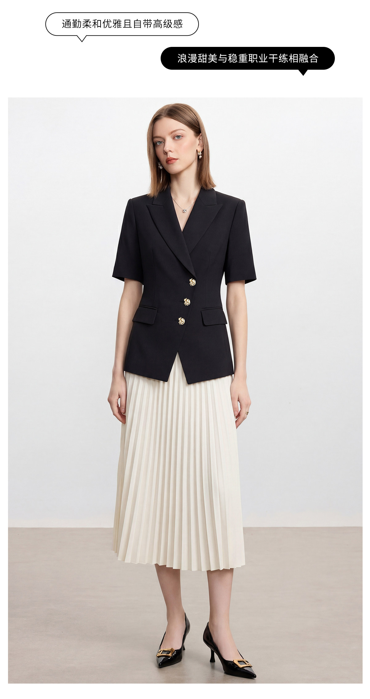 经典黑白配色,是职场穿搭里永不过时的王牌。黑色收腰西装自带利落气场,短袖剪裁适配夏日通勤,三颗精致金扣更是点睛之笔,低调又显贵。