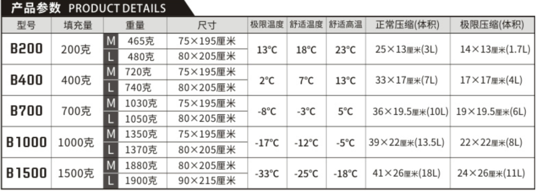 Ø B系列按羽绒填充量共有五款产品,这五款产品的舒适温标跨度从-25到18摄氏度,基本可以涵盖大部分户外出行的使用需求,使用选择非常灵活。