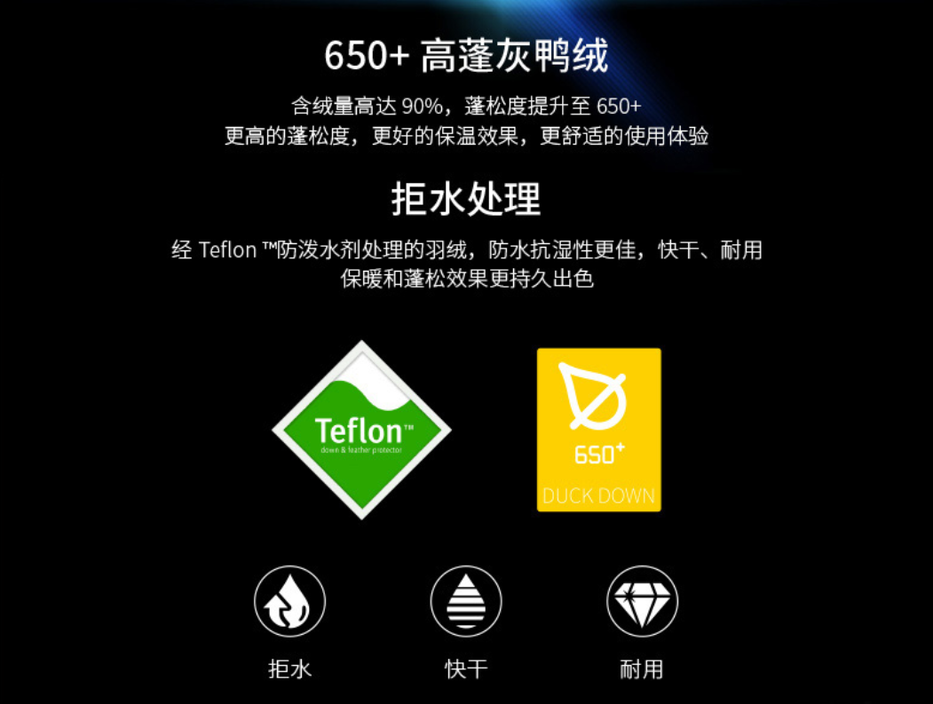 Ø 内部填充90%的650蓬松度的灰鸭绒,且经过TEFLON™工艺处理,兼具防泼水和保暖性能。压缩收纳轻松,方便使用者打包携带。