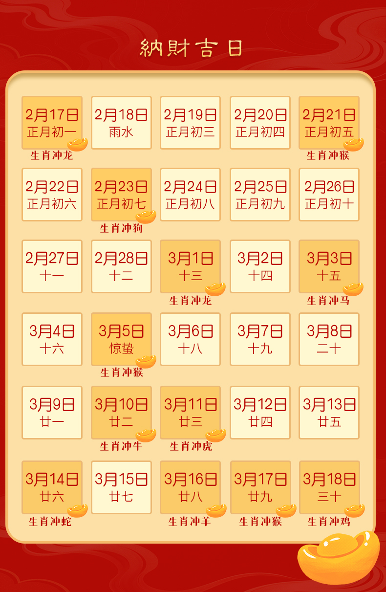 总之呢,正月初五是纳财的好日子,祈求财源广进。还有小编特意将正月纳财吉日分享给大家: