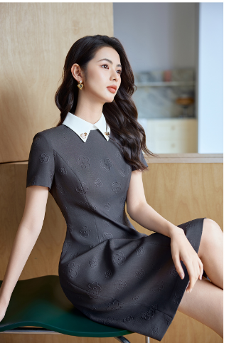 领子采用了经典的翻领设计,为整体造型增添了一份干练与精致。白色的领面与灰色的裙身形成鲜明对比,视觉上更具层次感,轻松提升整体的时尚度。
