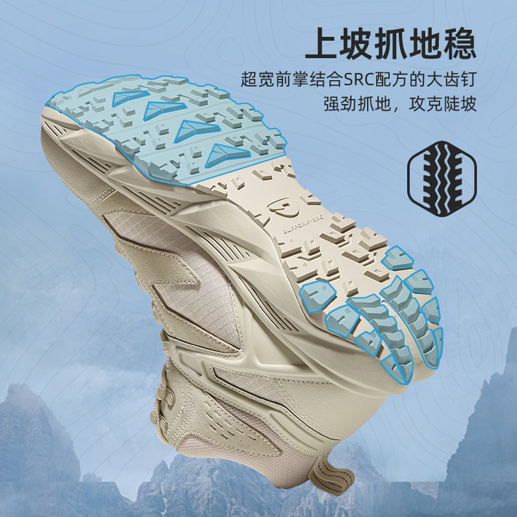 【上坡抓地力爆棚】 攻克陡坡难题,全靠它的超宽前掌和SRC配方(欧盟最高防滑标准!)的大齿钉(纯国产自研!)