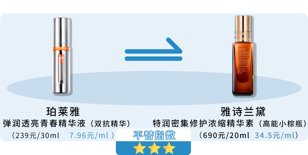 看得出雅诗兰黛高能小棕瓶的功效其实是更加全面和有科技感的,珀莱雅双抗精华主要在抗糖抗氧方面配方的设计还是很全面、完善的。所以虽然无法完全平替,但是对于没有太多问题的初老肌肤,用来做预防还是很不错的性价比之选。
