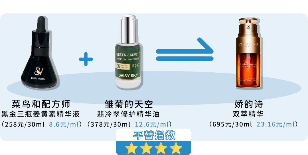 姜黄素精华液搭配翡冷翠精华油,基本可以达到跟娇韵诗双萃精华相似的功效,并且可以根据自己的需求进行更灵活的调整,比如现在冬天想要强化下修护和滋润,在DIY时候油相用量可以适当增加。