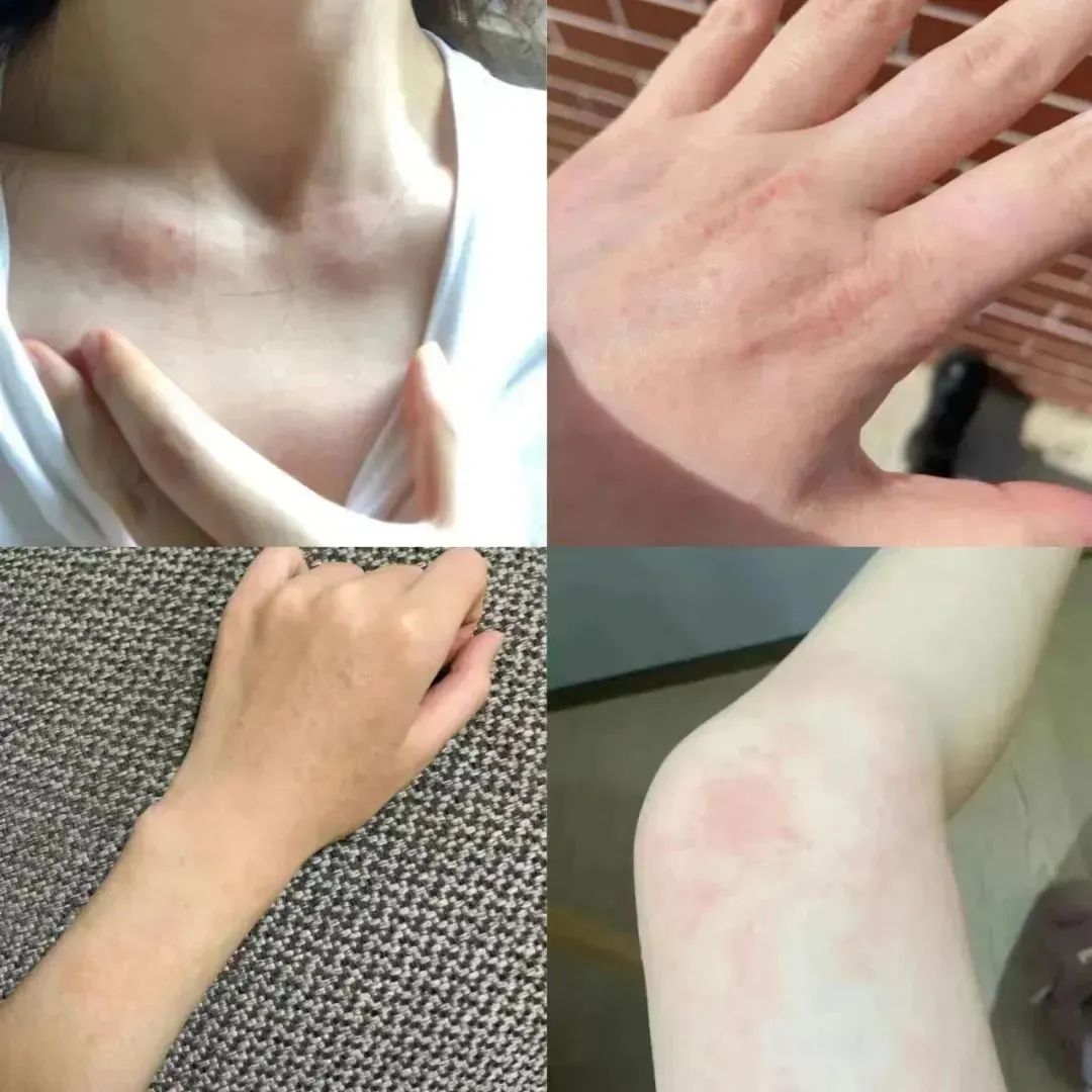 脸上、手上、腿上开始泛红,痒痒痒,控制不住的想要去挠,越挠越痒,红点点蔓延成一大片