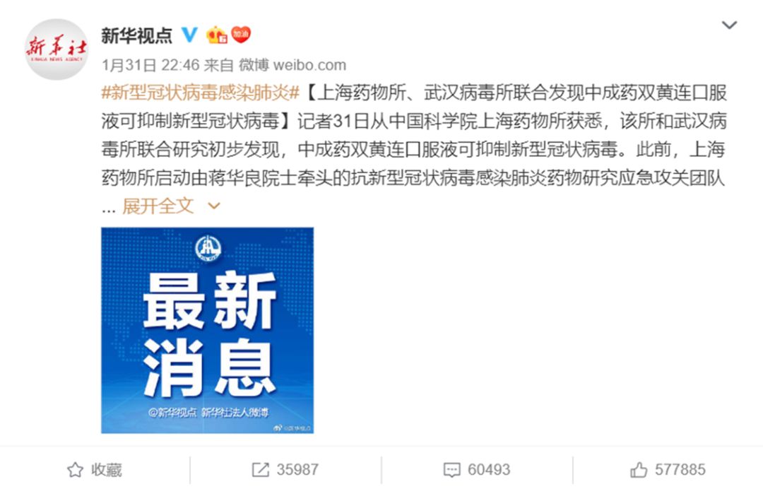 据新华视点报道,记者从中国科学院上海药物所获悉,该所和武汉病毒所联合研究初步发现,中成药双黄连口服液可抑制新型冠状病毒。