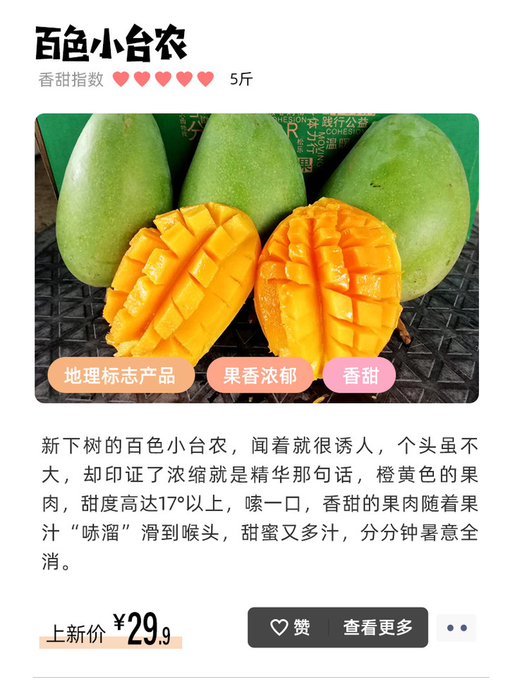 本周有:百色小台农、荞麦面,通江段木银耳,红豆薏米饼干、果蔬洗涤盐