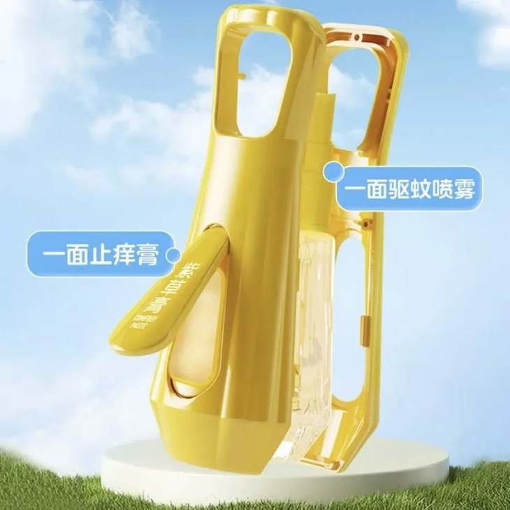 一面是防蚊的驱蚊喷雾,一面是舒缓止痒的紫草膏,小小的一瓶,就能顶两瓶的效果。