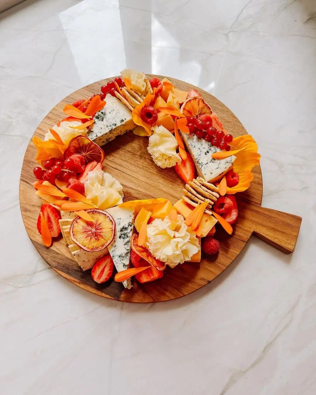 芝士拼盘是提前一天切好的,摆在木盘里,用保鲜膜轻轻包着放进冰箱。