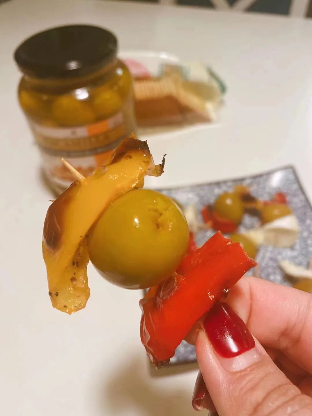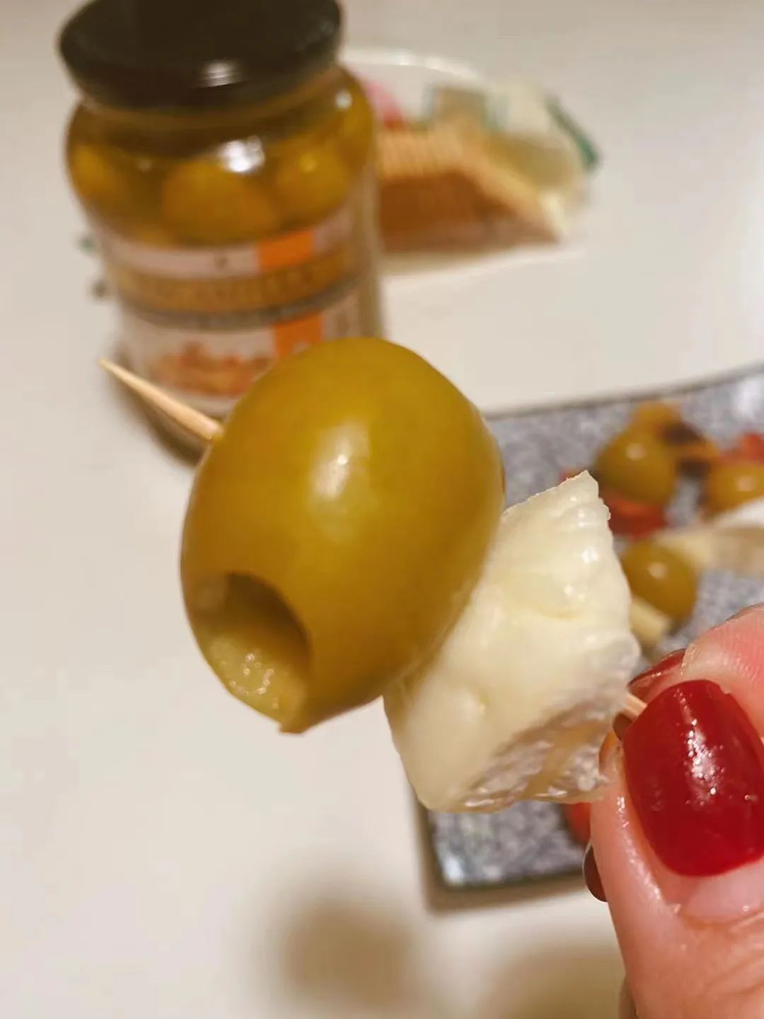 朋友聚会,来一道西班牙的开胃小菜,做finger food的tapas端给大家,更是少不了橄榄。橄榄、烤甜椒、软奶酪,拿牙签串在一起,纯正的欧洲风party立刻开启。
