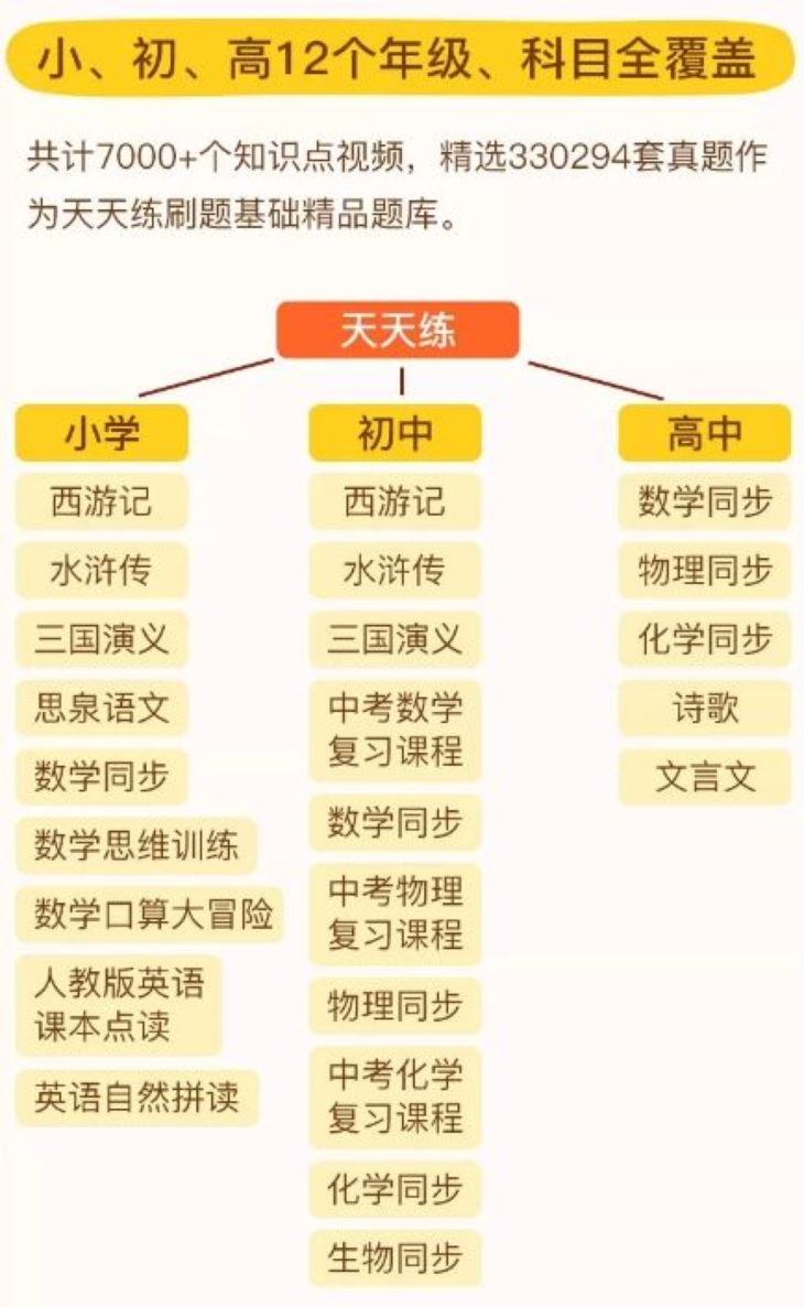 天天练覆盖了小初高12个年级,多版本教材,22个科目,集齐语数外、物理化学、大语文、数学思维、奥数、自然拼读等。