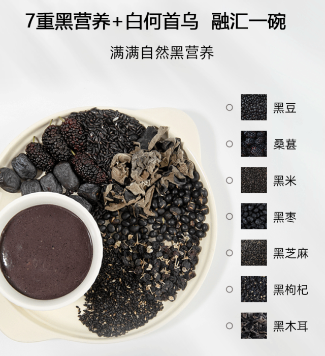 七黑白首乌粉对于头发的养护特别好,可预防脱发,现在都流行食补,养生又健康。口感香浓醇厚,营养美味。早起冲泡一杯当早餐很满足。没有乱七八糟的添加,吃着放心,乌黑的头发才是显得自己都活年轻了。