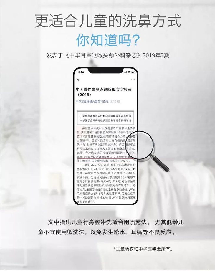 不会产生像传统的喷水式洗鼻器那样水流直入的侵入感,就也不用担心孩子不小心呛了鼻子。