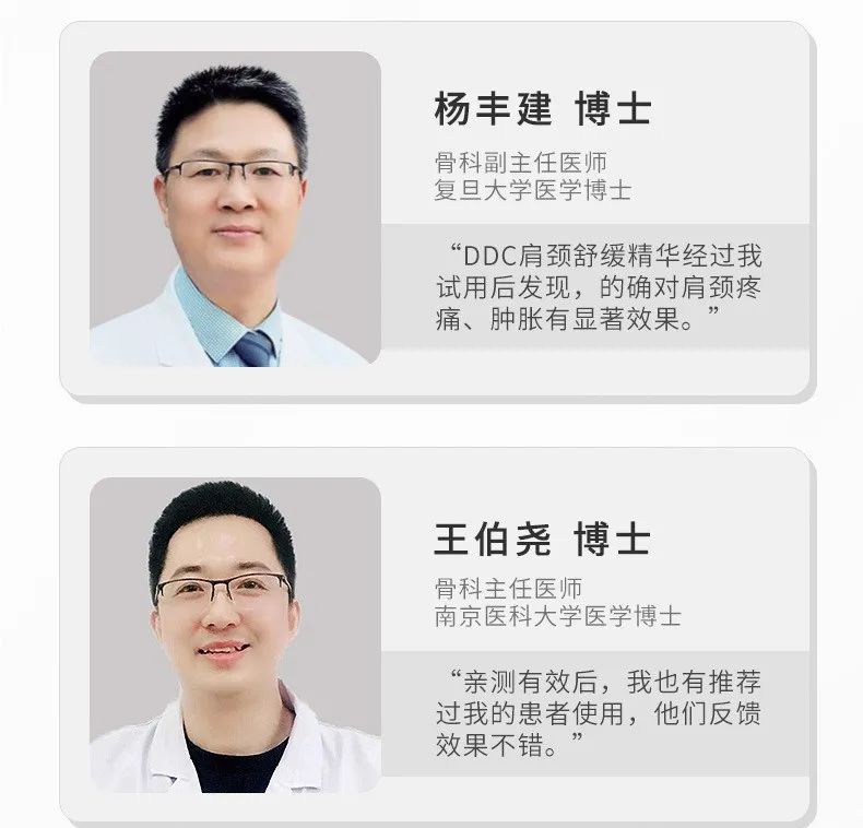 针对颈椎骨骼因长时间保持错误姿势,而引起的酸痛肿胀甚至潜在的骨骼变形风险,两位三甲医院著名骨科主任医师联合研发DDC肩颈舒缓液。