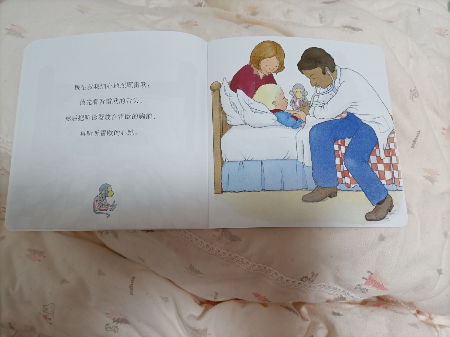 医生来了,看看他的舌头,拿出听诊器听听他的心跳。爸爸妈妈细心的照顾雷欧,波比也陪着他。