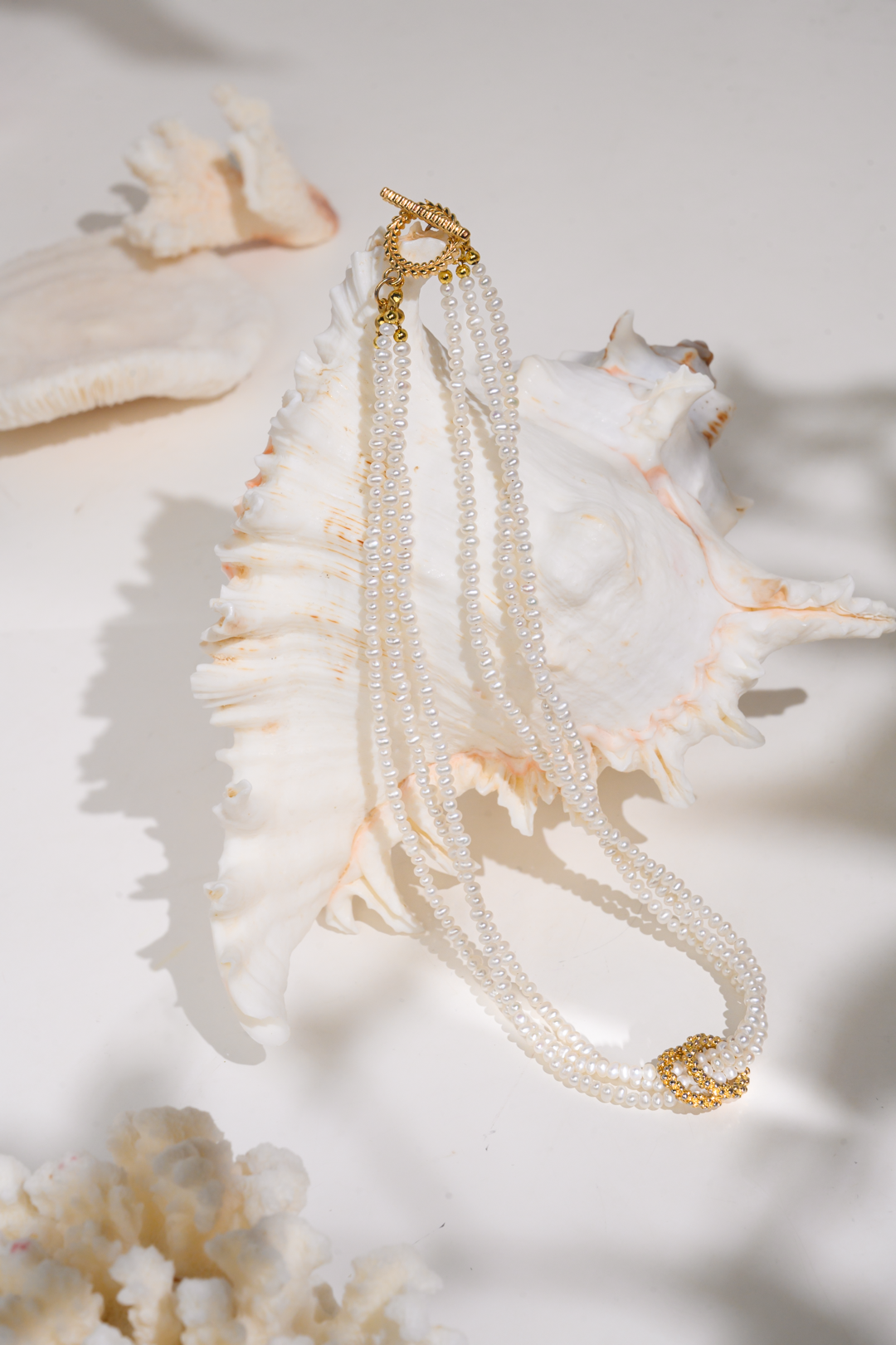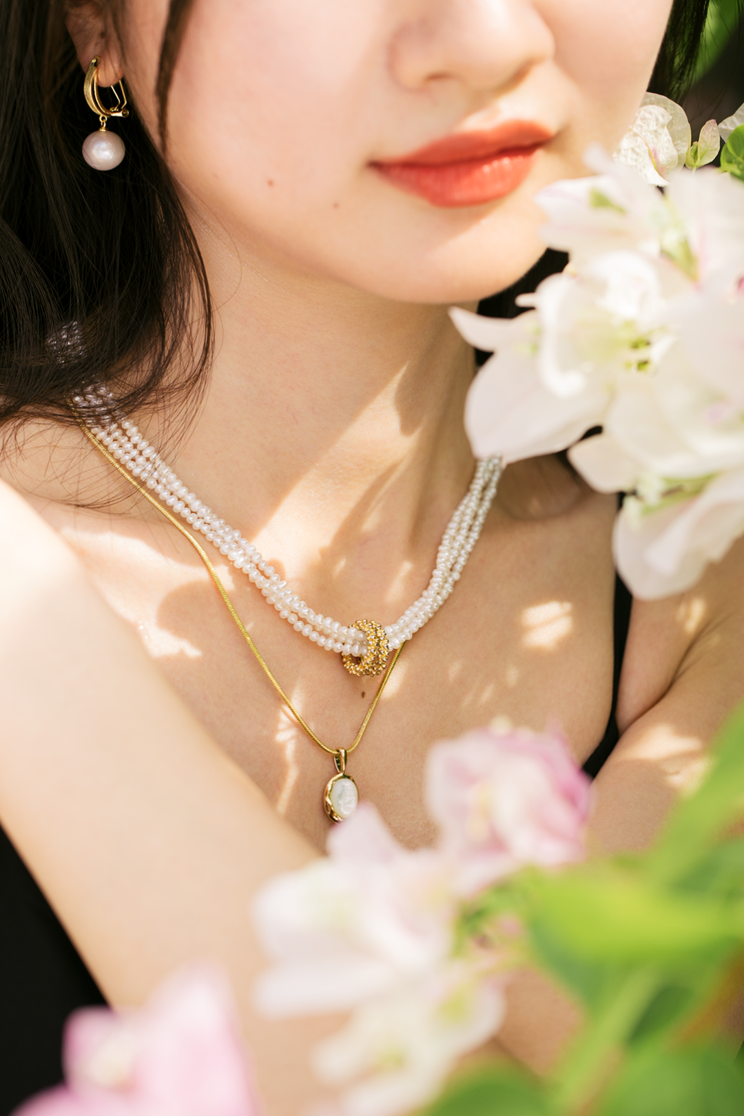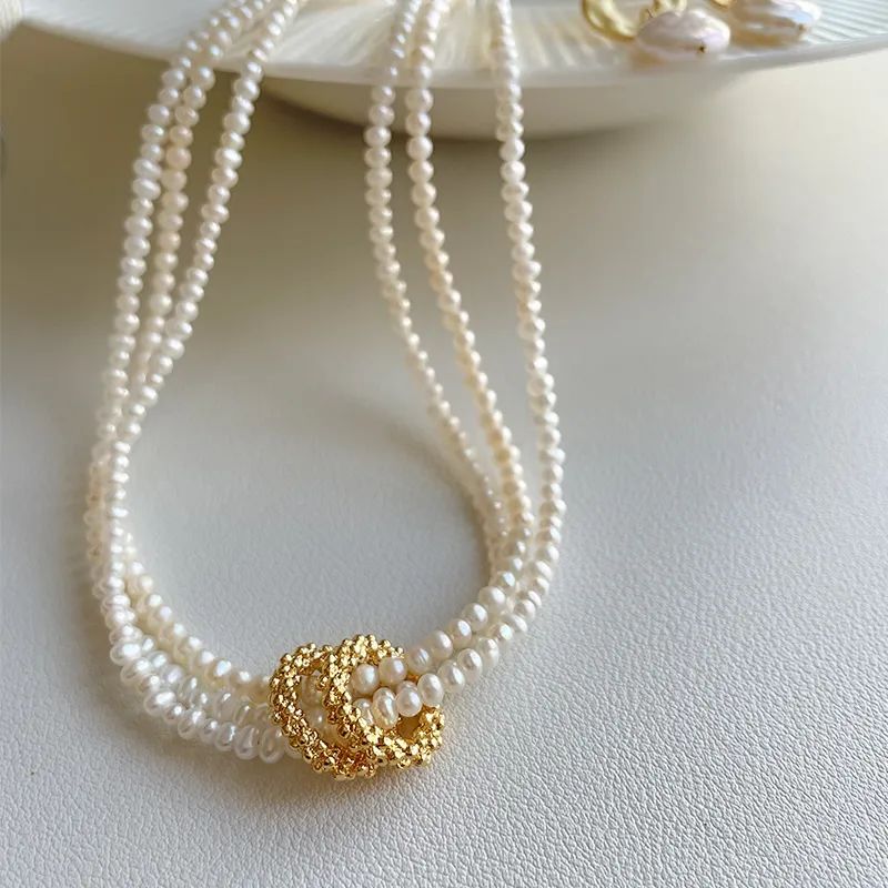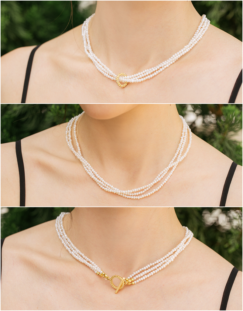 这条3层小珍珠项链是全篇造型感最强的,珍珠+金色,很适合打造轻法式复古风。▼