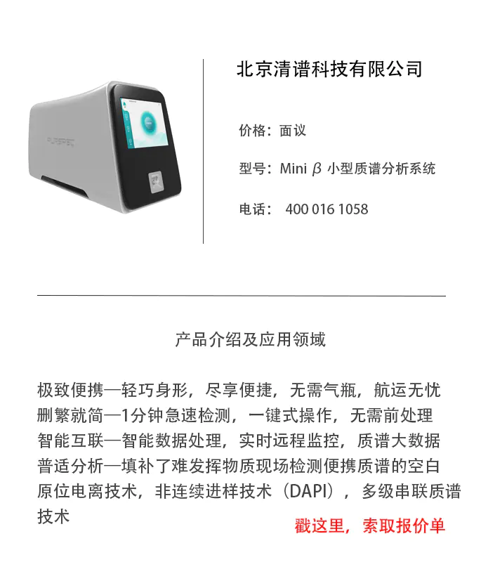 清谱科技是由归国知名专家、清华大学精密仪器系欧阳证教授创办的高科技企业,团队与清华大学及美国普渡大学深度合作,主营高端质谱检测设备的研发、生产和服务,为现场检测、科学研究、医疗诊断等领域提供实时、准确、简便的检测方案。公司拥有一支高学历、高素质的技术团队,专注于高端质谱分析产品的开发、生产和制造,依托于技术团队十多年积累的五代质谱仪器、十余项关键技术成果进行进一步研发优化和产学研转化,拥有国际前沿的便携式质谱开发经验,技术实力雄厚,设计了多款便携式质谱仪器,MS Mate质谱仪原位电离离子源及ΩAnalyzer脂质双键定位分析系统等产品,其中Mini β小型质谱分析系统获得2017年“BCEIA金奖”和“2017年科学仪器行业优秀新产品”奖。