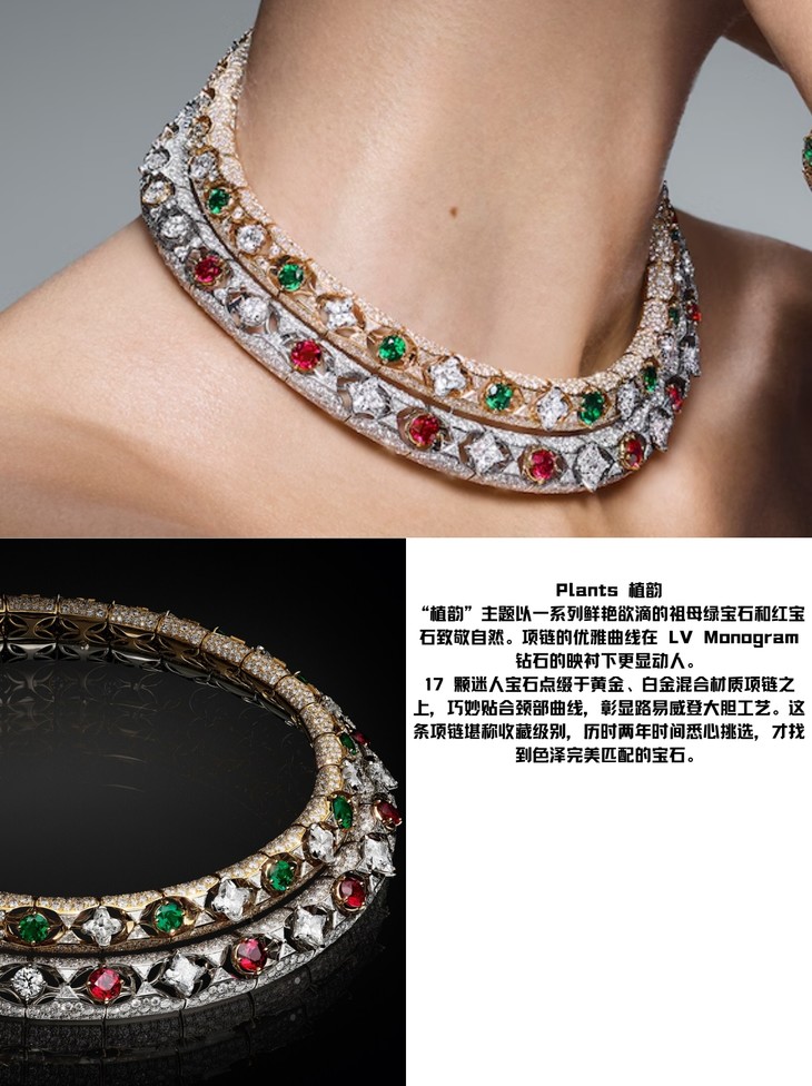 祖母绿、红宝石,LV Monogram钻石映衬,17颗宝石,两年挑选,色泽完美匹配。